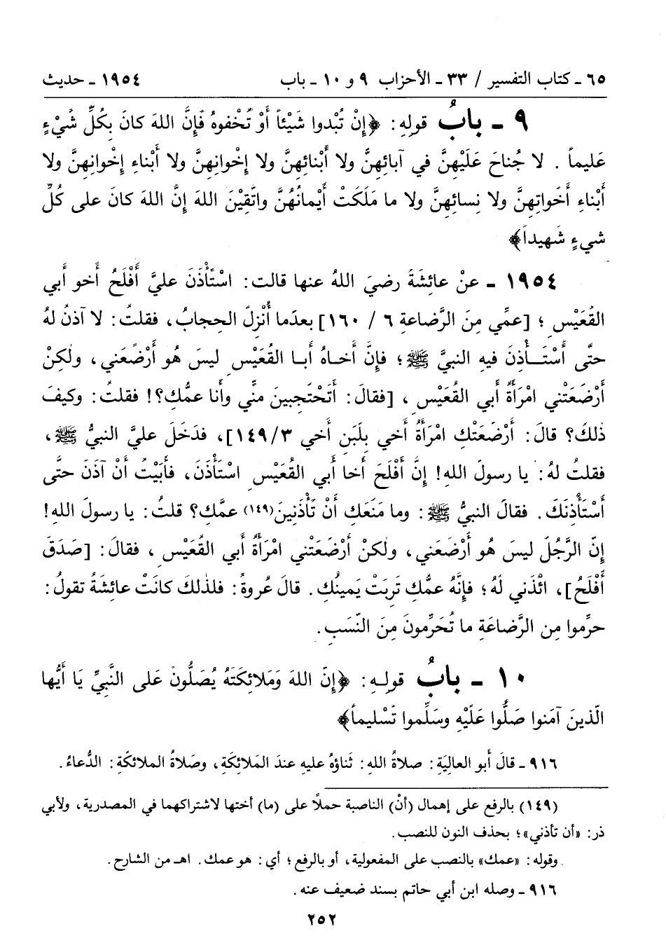 1954 - عنْ عَائِشَةَ - رضى الله عنها - قَالَتِ: اسْتَأْذَنَ عَلَيَّ أَفْلَحُ أَخُو أَبِى الْقُعَيْسِ؛ [عمَّي مِنَ الرَّضاعةِ 6/ 160] بَعْدَ مَا أُنْزِلَ الْحِجَابُ، فَقُلْتُ: لاَ آذَنُ لَهُ حَتَّى أَسْتَأْذِنَ فِيهِ النَّبِيَّ - صلى الله عليه وسلم -؛ فَإِنَّ أَخَاهُ أَبَا الْقُعَيْسِ لَيْسَ هُوَ أَرْضَعَنِى، وَلَكِنْ أَرْضَعَتْنِى امْرَأَةُ أَبِى الْقُعَيْسِ، [فَقَالَ: أَتَحْتَجِبِينَ مِنِّى وَأَنَا عَمُّكِ؟! فَقُلْتُ: وَكَيْفَ ذَلِكَ قَالَ: أَرْضَعَتْكِ امْرَأَةُ أَخِى بِلَبَنِ أَخِى3/ 149] , فَدَخَلَ عَلَىَّ النَّبِيُّ - صلى الله عليه وسلم -، فَقُلْتُ لَهُ: يَا رَسُولَ اللَّهِ! إِنَّ أَفْلَحَ أَخَا أَبِى الْقُعَيْسِ اسْتَأْذَنَ، فَأَبَيْتُ أَنْ آذَنَ حَتَّى أَسْتَأْذِنَكَ. فَقَالَ النَّبِيُّ - صلى الله عليه وسلم -: وَمَا مَنَعَكِ أَنْ تَأْذَنِينَ (149) عَمُّكِ؟ قُلْتُ: يَا رَسُولَ اللَّهِ! إِنَّ الرَّجُلَ لَيْسَ هُوَ أَرْضَعَنِى، وَلَكِنْ أَرْضَعَتْنِى امْرَأَةُ أَبِى الْقُعَيْسِ، فَقَالَ: [صَدَقَ أَفْلَحُ] , ائْذَنِى لَهُ؛ فَإِنَّهُ عَمُّكِ تَرِبَتْ يَمِينُكِ. قَالَ عُرْوَةُ: فَلِذَلِكَ كَانَتْ عَائِشَةُ تَقُولُ: حَرِّمُوا مِنَ الرَّضَاعَةِ مَا تُحَرِّمُونَ مِنَ النَّسَبِ.