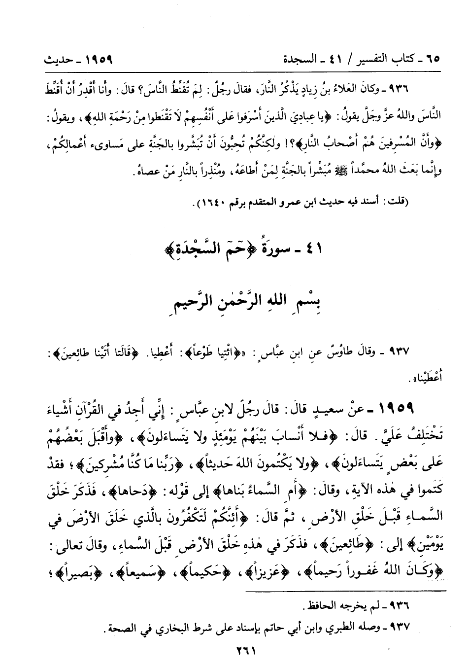 1959 - عَنْ سَعِيدٍ قَالَ: قَالَ رَجُلٌ لاِبْنِ عَبَّاسٍ: إِنِّى أَجِدُ فِى الْقُرْآنِ أَشْيَاءَ تَخْتَلِفُ عَلَىَّ. قَالَ: {فَلاَ أَنْسَابَ بَيْنَهُمْ يَوْمَئِذٍ وَلاَ يَتَسَاءَلُونَ} , {وَأَقْبَلَ بَعْضُهُمْ عَلَى بَعْضٍ يَتَسَاءَلُونَ} , {وَلاَ يَكْتُمُونَ اللَّهَ حَدِيثًا}. {رَبِّنَا مَا كُنَّا مُشْرِكِينَ}؛ فَقَدْ كَتَمُوا فِى هَذِهِ الآيَةِ، وَقَالَ: {أَمِ السَّمَاءُ بَنَاهَا} إِلَى قَوْلِهِ: {دَحَاهَا}، فَذَكَرَ خَلْقَ السَّمَاءِ قَبْلَ خَلْقِ الأَرْضِ، ثُمَّ قَالَ: {أَئِنَّكُمْ لَتَكْفُرُونَ بِالَّذِى خَلَقَ الأَرْضَ فِى يَوْمَيْنِ} إِلَى: {طَائِعِينَ} , فَذَكَرَ فِى هَذِهِ خَلْقَ الأَرْضِ قَبْلَ السَّمَاءِ، وَقَالَ تعالى: {وَكَانَ اللَّهُ غَفُورًا رَحِيمًا} , {عَزِيزًا} , {حَكِيمًا} , {سَمِيعًا} , {بَصِيرًا}؛