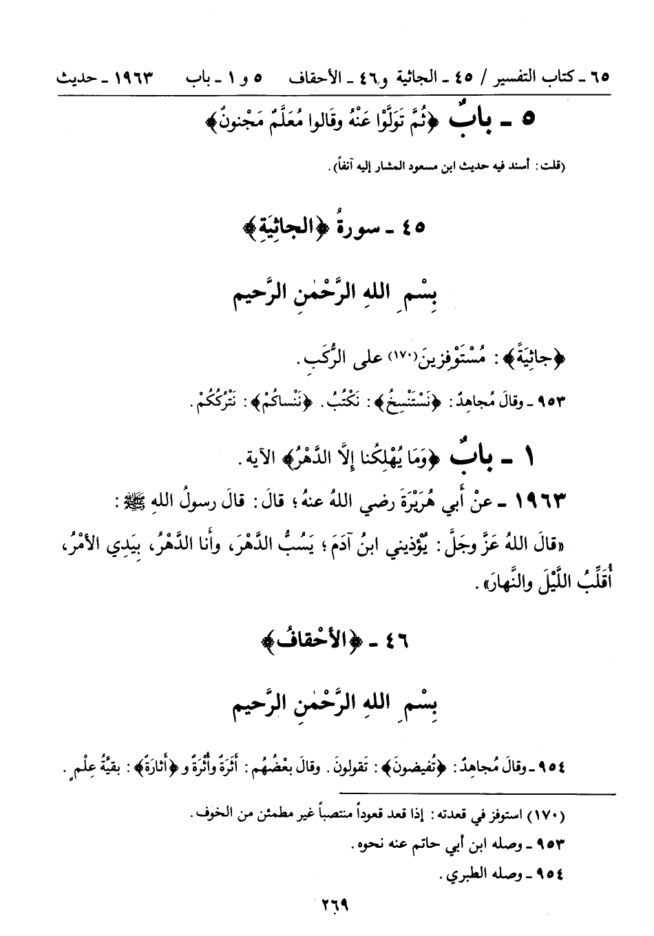 954 - وقالَ مُجاهِد: {تُفيضونَ}: تَقولونَ. وقالَ بعْضُهُم: أثَرَةٌ وأُثْرَةٌ و {أثارَةٌ}: بقيَّةُ عِلْمٍ.