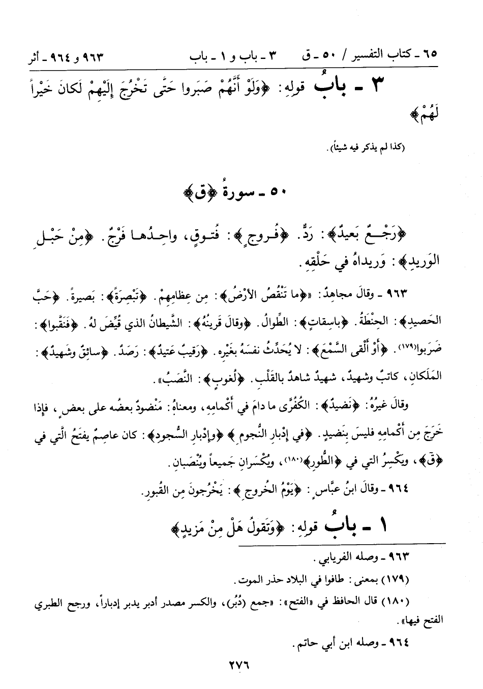{رَجْعٌ بَعيدٌ}: رَدٌّ. {فروجٍ}: فُتوقٍ، واحِدُها فَرْجٌ. {مِنْ حَبْلِ الوَريدِ}: وَريداهُ في حَلْقِهِ.