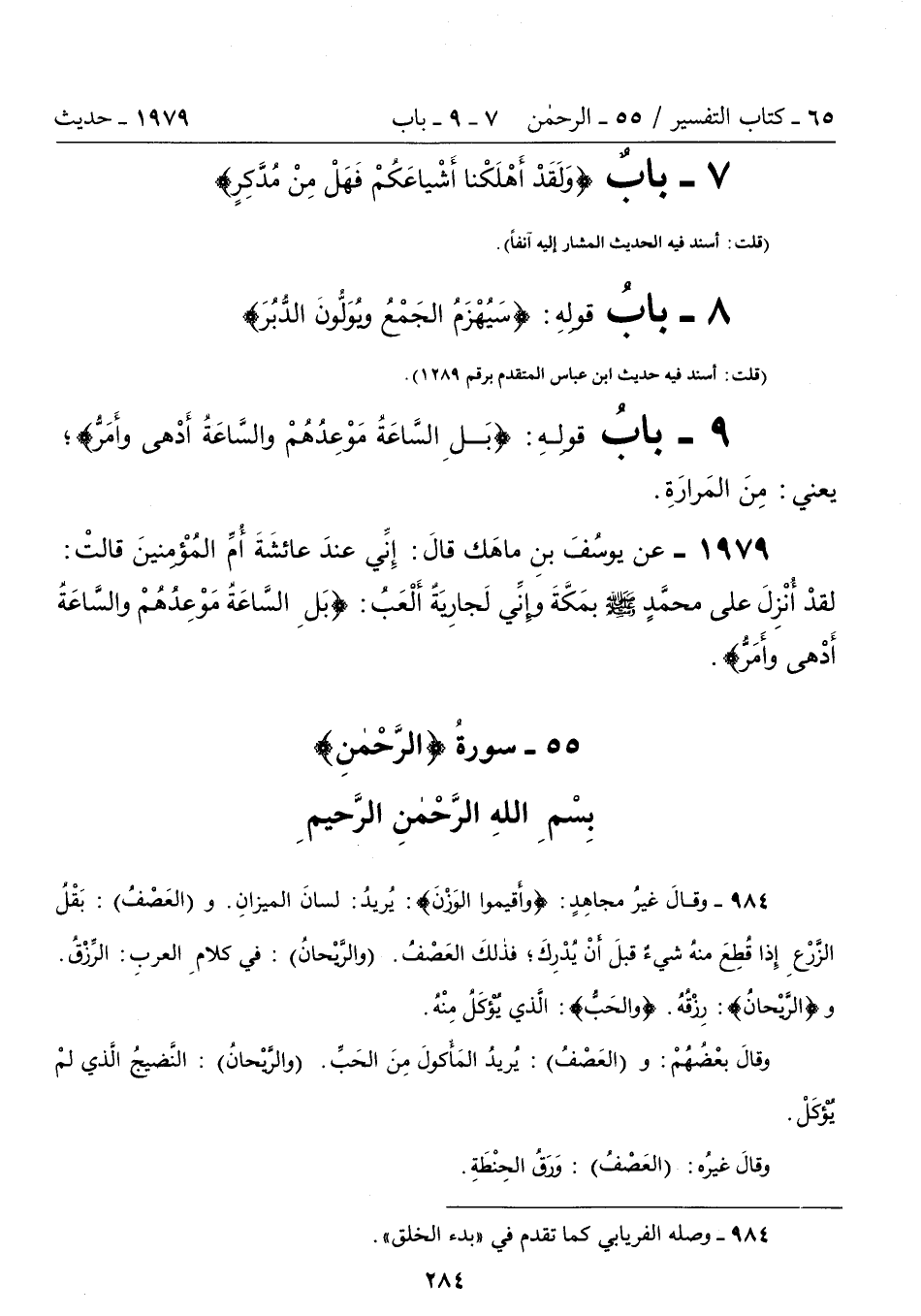 1979 - عن يُوسُفُ بْنُ مَاهَكَ قَالَ: إِنِّى عِنْدَ عَائِشَةَ أُمِّ الْمُؤْمِنِينَ قَالَتْ: لَقَدْ أُنْزِلَ عَلَى مُحَمَّدٍ - صلى الله عليه وسلم - بِمَكَّةَ، وَإِنِّى لَجَارِيَةٌ أَلْعَبُ: {بَلِ السَّاعَةُ مَوْعِدُهُمْ وَالسَّاعَةُ أَدْهَى وَأَمَرُّ}.