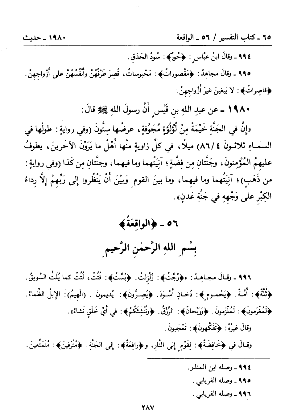 995 - وقالَ مجاهِدٌ: {مَقْصوراتٌ}: مَحْبوساتٌ، قُصِرَ طَرْفُهُنَّ وأَنْفُسُهُنَّ على أَزْواجِهِنَّ. {قاصِراتٌ}: لا يَبغينَ غيرَ أَزْواجِهِنَّ.