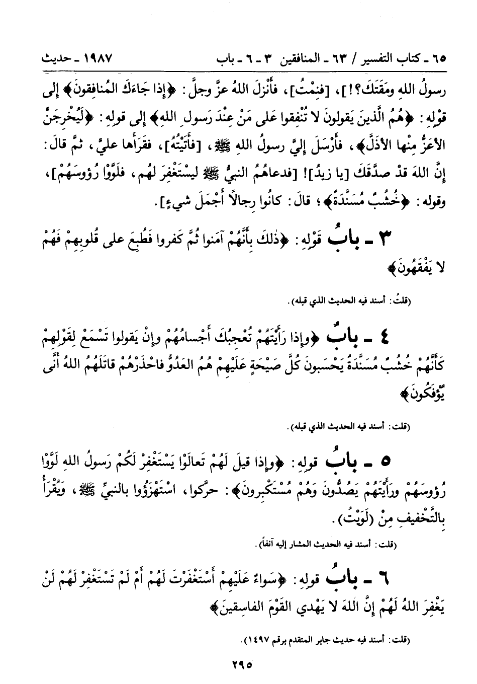 4 - بابٌ {وَإِذَا رَأَيْتَهُمْ تُعْجِبُكَ أَجْسَامُهُمْ وَإِنْ يَقُولُوا تَسْمَعْ لِقَوْلِهِمْ كَأَنَّهُمْ خُشُبٌ مُسَنَّدَةٌ يَحْسَبُونَ كُلَّ صَيْحَةٍ عَلَيْهِمْ هُمُ الْعَدُوُّ فَاحْذَرْهُمْ قَاتَلَهُمُ اللَّهُ أَنَّى يُؤْفَكُونَ}