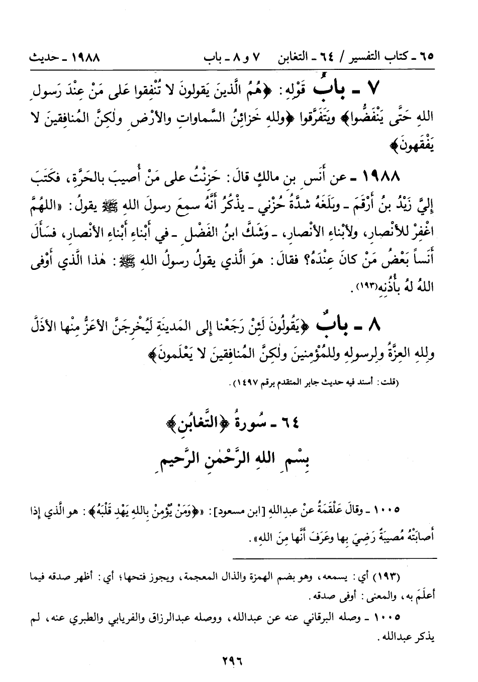 1005 - وقالَ عَلْقَمَةُ عنْ عبدِ اللهِ [ابن مسعود]: " {وَمَنْ يُؤْمِنْ بِاللَّهِ يَهْدِ قَلْبَهُ}: هو الَّذى إذا أصابَتْهُ مُصيبَةٌ رَضِيَ بِها وعَرَفَ أنَّها مِنَ اللهِ".