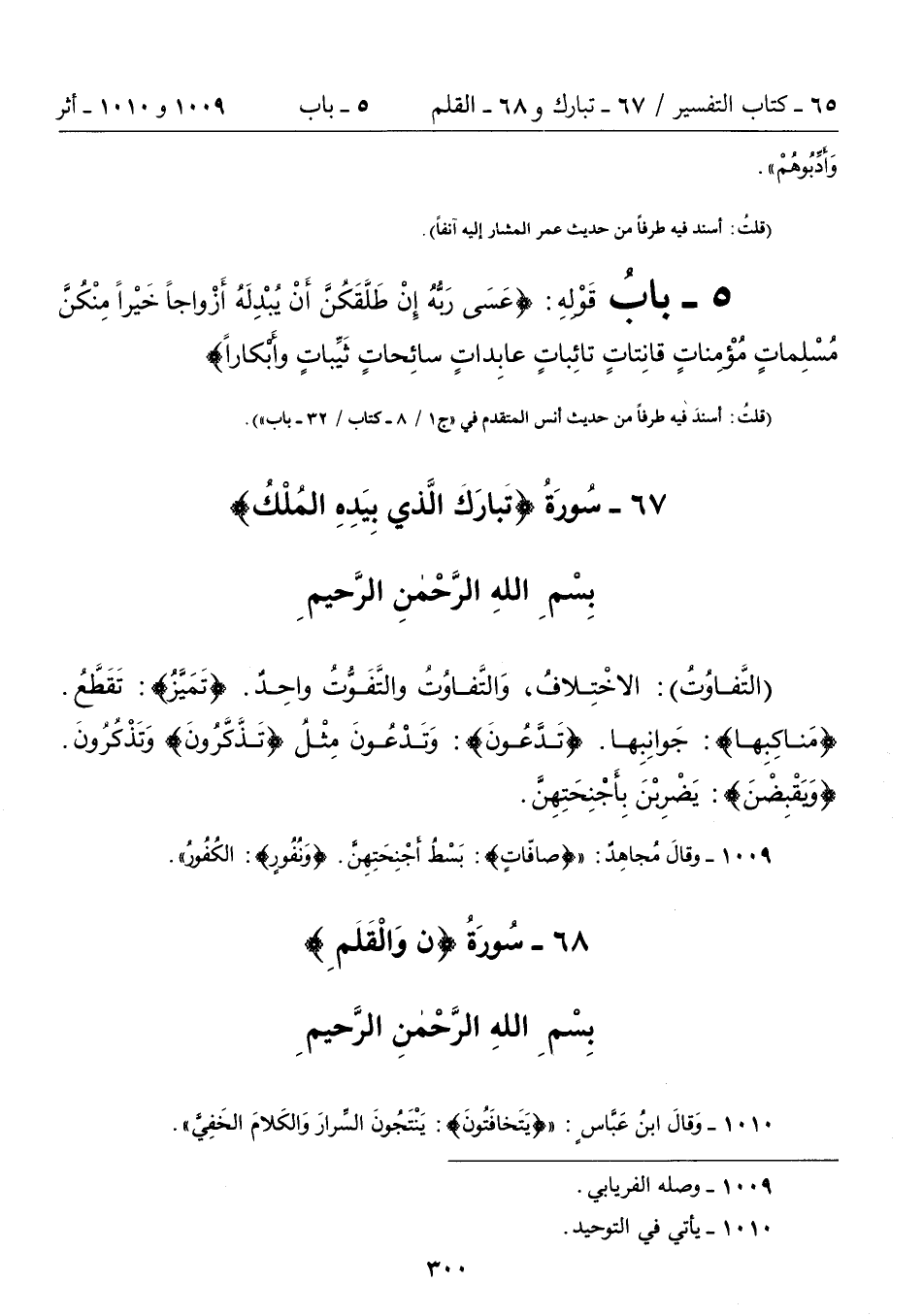 1009 - وقالَ مُجَاهِدٌ: {صَافَّاتٍ}: بَسْطُ أَجْنِحَتِهِنَّ، {وَنُفُورٍ}: الْكُفُورُ".