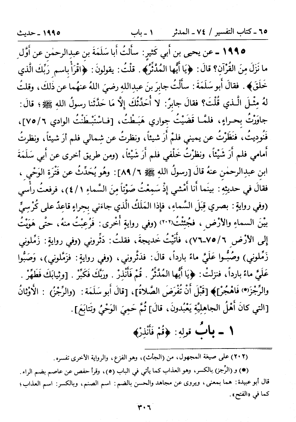 1995 - عَنْ يَحْيَى بْنِ أَبِى كَثِيرٍ: سَأَلْتُ أَبَا سَلَمَةَ بْنَ عَبْدِ الرَّحْمَنِ عَنْ أَوَّلِ مَا نَزَلَ مِنَ الْقُرْآنِ؟ قَالَ: {يَا أَيُّهَا الْمُدَّثِّرُ}. قُلْتُ: يَقُولُونَ: {اقْرَأْ بِاسْمِ رَبِّكَ الَّذِى خَلَقَ}. فَقَالَ أَبُو سَلَمَةَ: سَأَلْتُ جَابِرَ بْنَ عَبْدِ اللَّهِ رضى الله عنهما عَنْ ذَلِكَ، وَقُلْتُ لَهُ مِثْلَ الَّذِى قُلْتَ؟ فَقَالَ جَابِرٌ: لاَ أُحَدِّثُكَ إِلاَّ مَا حَدَّثَنَا رَسُولُ اللَّهِ - صلى الله عليه وسلم -؛ قَالَ: «جَاوَرْتُ بِحِرَاءٍ، فَلَمَّا قَضَيْتُ جِوَارِى هَبَطْتُ، [فاسْتَبْطَنْتُ الوادى 6/ 75] , فَنُودِيتُ، فَنَظَرْتُ عَنْ يَمِينِى فَلَمْ أَرَ شَيْئًا، وَنَظَرْتُ عَنْ شِمَالِى فَلَمْ أَرَ شَيْئًا، وَنَظَرْتُ أَمَامِى فَلَمْ أَرَ شَيْئًا، وَنَظَرْتُ خَلْفِى فَلَمْ أَرَ شَيْئًا، فَرَفَعْتُ رَأْسِى فَرَأَيْتُ شَيْئًا، (ومن طريق أخرى عن أَبي سَلَمَةَ ابنِ عبدِ الرحمنِ عنهُ قالَ [رسولُ اللهِ - صلى الله عليه وسلم 6/ 89]: وهُو يحَدِّث عن فَتْرَةِ الوَحْيِ، فقالَ فى حديثِهِ: بَيْنَما أَنَا أَمْشِى سَمِعْتُ صَوْتًا مِنَ السَّمَاءِ 1/ 4) فرفعتُ رأسي (وفى روايةٍ: بَصَرِى قِبَلَ السَّمَاءِ , فَإِذَا الْمَلَكُ الَّذِى جَاءَنِى بِحِرَاءٍ قَاعِدٌ عَلَى كُرْسِىٍّ بَيْنَ السَّمَاءِ وَالأَرْضِ، فَجُئِثْتُ (202) (وفى روايةٍ أخرى: فَرُعِبْتُ مِنْهُ , حَتَّى هَوَيْتُ إِلَى الأَرْضِ 6/ 75 - 76) , فَأَتَيْتُ خَدِيجَةَ، فَقُلْتُ: دَثِّرُونِى (وفى روايةٍ: زَمِّلوني زَمِّلوني) وَصُبُّوا عَلَىَّ مَاءً بَارِدًا، قَالَ: فَدَثَّرُونِى , (وفى روايةٍ: فزَمَّلوني) , وَصَبُّوا عَلَىَّ مَاءً بَارِدًا , فَنَزَلَتْ: {يَا أَيُّهَا الْمُدَّثِّرُ. قُمْ فَأَنْذِرْ. وَرَبَّكَ فَكَبِّرْ. [وَثِيَابَكَ فَطَهِّرْ. وَالرُّجْزَ (*) فَاهْجُرْ]} [قَبْلَ أَنْ تُفْرَضَ الصَّلاةُ] , [قالَ أَبو سَلَمَة: (والرِّجْزُ): الَأوْثانُ [التي كانَ أَهْلُ الجاهِلِيَّةِ يَعْبُدونَ، قالَ] ثُمَّ حَمِيَ الوَحْيُ وتَتابَعَ].
