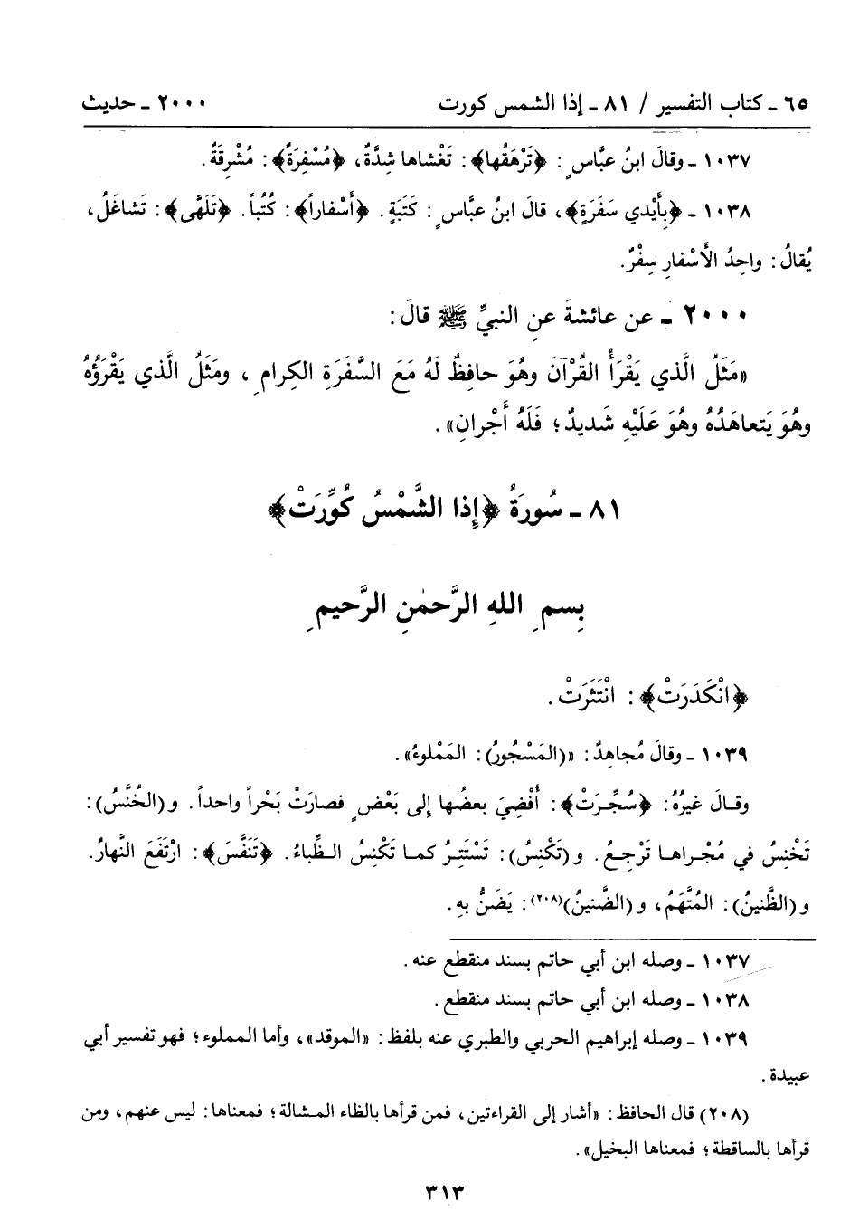 1038 - {بِأَيْدِى سَفَرَةٍ} , وَقَالَ ابْنُ عَبَّاسٍ: كَتَبَةٍ. {أَسْفَارًا}: كُتُبًا. {تَلَهَّى}: تَشَاغَلَ، يُقَالُ: وَاحِدُ الأَسْفَارِ سِفْرٌ.