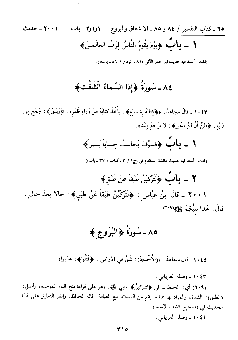 2001 - قالَ ابنُ عبَّاسٍ: {لَتَرْكَبُنَّ طَبَقَّا عَنْ طَبَقٍ}: حالاً بعدَ حالٍ. قالَ: هذا نَبِيُّكمْ - صلى الله عليه وسلم (209).