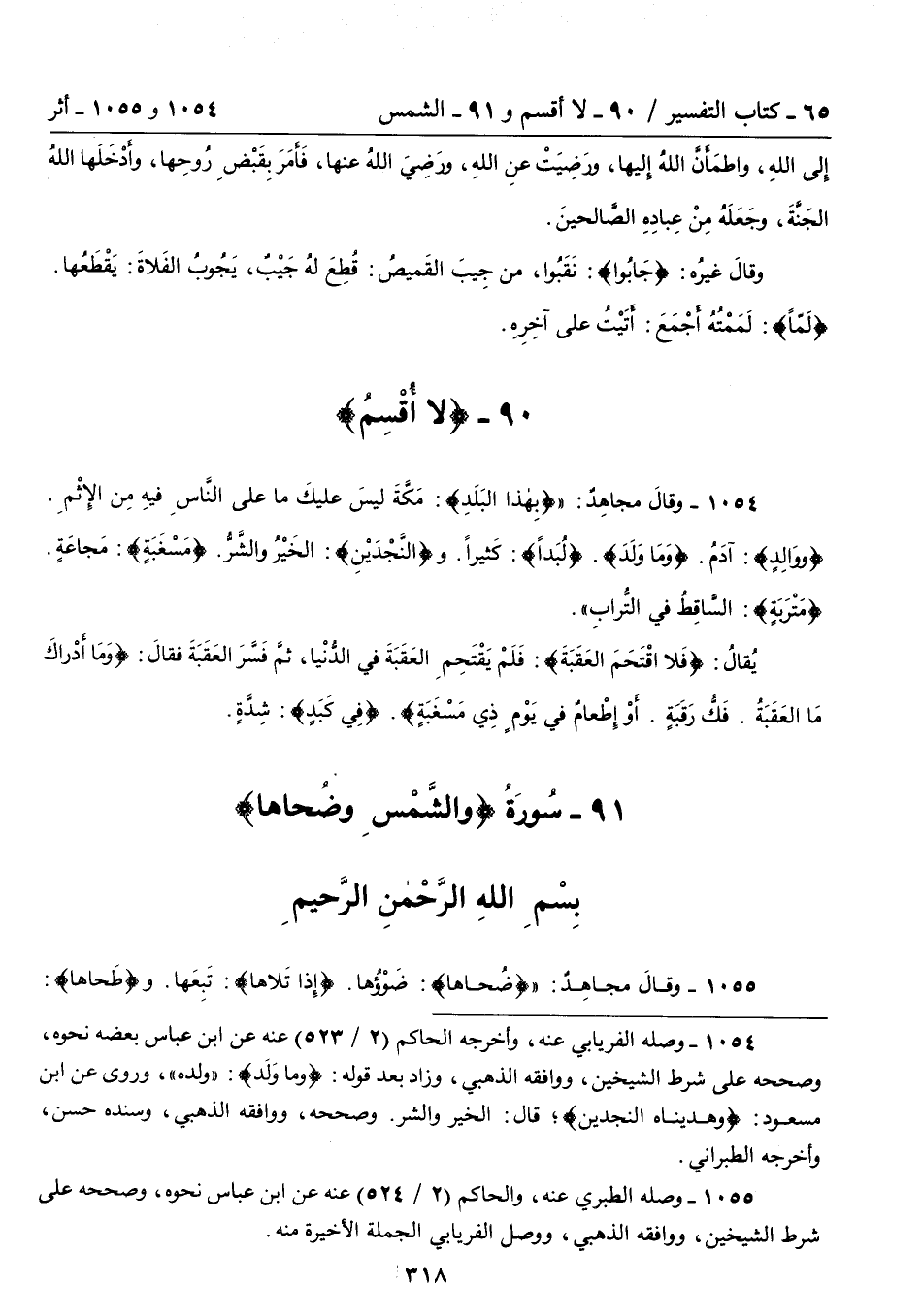1054 - وصله الفريابي عنه، وأخرجه الحاكم (2/ 523) عنه عن ابن عباس بعضه نحوه، وصححه على شرط الشيخين، ووافقه الذهبي، وزاد بعد قوله: {وما وَلَد}: "ولده"، وروى عن ابن مسعود: {وهديناه النجدين}؛ قال: الخير والشر. وصححه، ووافقه الذهبي، وسنده حسن، وأخرجه الطبراني.