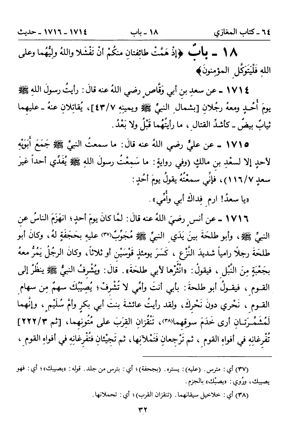 1716 - عن أنسٍ رضيَ اللهُ عنه قالَ: لَمَّا كَانَ يَوْمَ أُحُدٍ؛ انْهَزَمَ النَّاسُ عَنِ النَّبِيِّ - صلى الله عليه وسلم -، وَأَبُو طَلْحَةَ بَيْنَ يَدَىِ النَّبِيِّ - صلى الله عليه وسلم - مُجَوِّبٌ (37) عَلَيْهِ بِحَجَفَةٍ لَهُ، وَكَانَ أَبُو طَلْحَةَ رَجُلاً رَامِيًا شَدِيدَ النَّزْعِ، كَسَرَ يَوْمَئِذٍ قَوْسَيْنِ أَوْ ثَلاَثًا، وَكَانَ الرَّجُلُ يَمُرُّ مَعَهُ بِجَعْبَةٍ مِنَ النَّبْلِ، فَيَقُولُ "انْثُرْهَا لأَبِى طَلْحَةَ". قَالَ: وَيُشْرِفُ النَّبِىُّ - صلى الله عليه وسلم - يَنْظُرُ إِلَى الْقَوْمِ، فَيَقُولُ أَبُو طَلْحَةَ: بِأَبِى أَنْتَ وَأُمِّى لاَ تُشْرِفْ؛ يُصِيبُكَ سَهْمٌ مِنْ سِهَامِ الْقَوْمِ، نَحْرِى دُونَ نَحْرِكَ، وَلَقَدْ رَأَيْتُ عَائِشَةَ بِنْتَ أَبِى بَكْرٍ وَأُمَّ سُلَيْمٍ، وَإِنَّهُمَا لَمُشَمِّرَتَانِ أَرَى خَدَمَ سُوقِهِمَا (38)، تَنْقُزَانِ الْقِرَبَ عَلَى مُتُونِهِمَا، [ثم 3/ 222] تُفْرِغَانِهِ فِى أَفْوَاهِ الْقَوْمِ، ثُمَّ تَرْجِعَانِ فَتَمْلآنِهَا، ثُمَّ تَجِيئَانِ فَتُفْرِغَانِهِ فِى أَفْوَاهِ الْقَوْمِ،