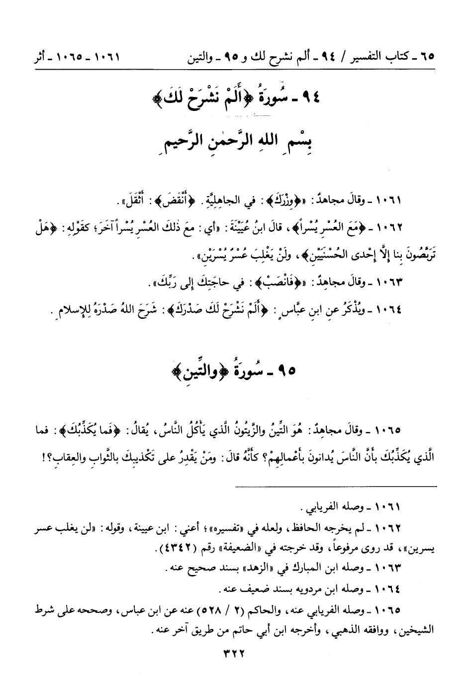 1062 - {مَعَ الْعُسْرِ يُسْرًا} , قَالَ ابْنُ عُيَيْنَةَ: "أَىْ: مَعَ ذَلِكَ الْعُسْرِ يُسْرًا آخَرَ؛ كَقَوْلِهِ: {هَلْ تَرَبَّصُونَ بِنَا إِلاَّ إِحْدَى الْحُسْنَيَيْنِ} , وَلَنْ يَغْلِبَ عُسْرٌ يُسْرَيْنِ".