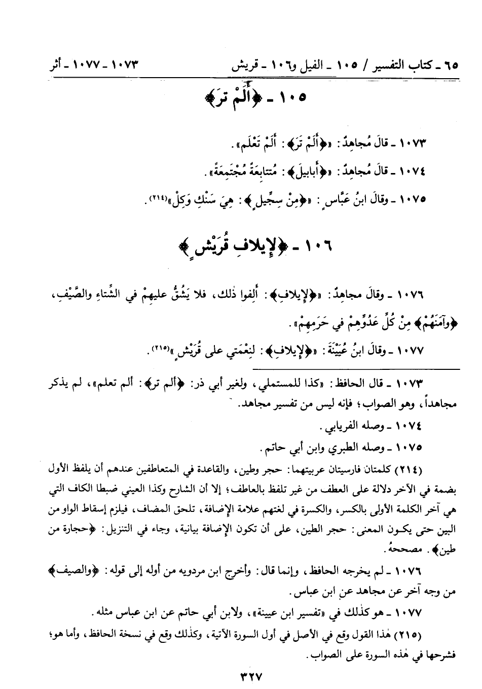 1077 - قَالَ ابْنُ عُيَيْنَةَ: " {لإِيلاَفِ}: لِنِعْمَتِى عَلَى قُرَيْشٍ" (215).