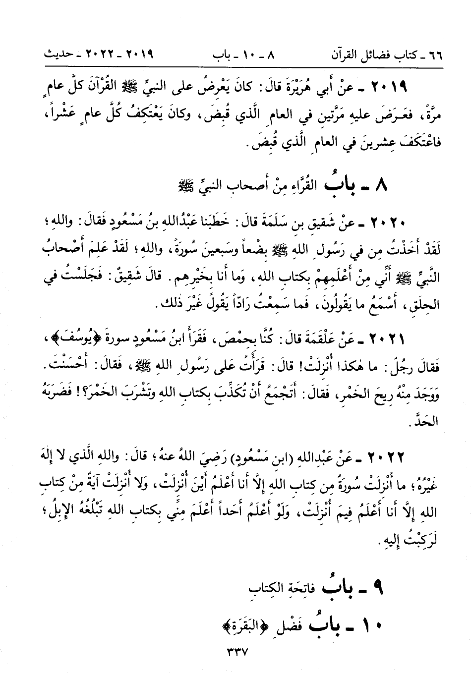 2022 - عَنْ عَبْدِ اللهِ (ابنِ مَسْعُودٍ) رَضيَ اللهُ عنهُ؛ قالَ: وَاللَّهِ الَّذِى لاَ إِلَهَ غَيْرُهُ؛ مَا أُنْزِلَتْ سُورَةٌ مِنْ كِتَابِ اللَّهِ إِلاَّ أَنَا أَعْلَمُ أَيْنَ أُنْزِلَتْ، وَلاَ أُنْزِلَتْ آيَةٌ مِنْ كِتَابِ اللَّهِ إِلاَّ أَنَا أَعْلَمُ فِيمَ أُنْزِلَتْ، وَلَوْ أَعْلَمُ أَحَدًا أَعْلَمَ مِنِّى بِكِتَابِ اللَّهِ تُبَلِّغُهُ الإِبِلُ؛ لَرَكِبْتُ إِلَيْهِ.