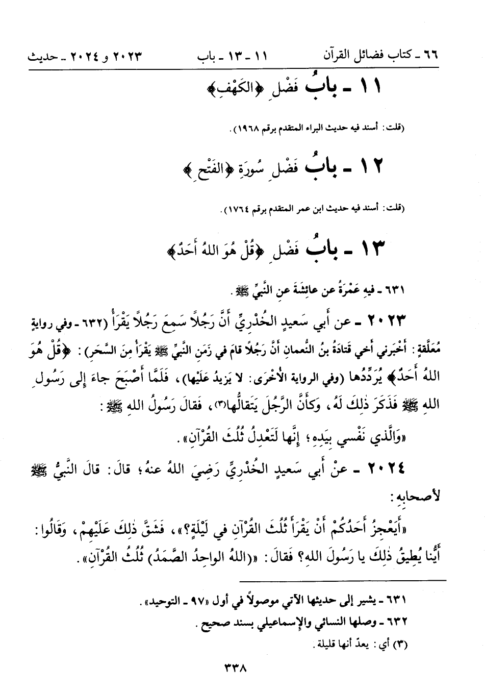 2023 - عَنْ أَبِى سَعِيدٍ الْخُدْرِىِّ أَنَّ رَجُلاً سَمِعَ رَجُلاً يَقْرَأُ (632 - في روايةٍ مُعَلَّقةٍ: أخْبَرني أخي قَتادَةُ بنُ النُّعمانِ أنَّ رَجُلاً قامَ في زَمَنِ النبيِّ - صلى الله عليه وسلم - يَقْرَأْ مِنَ السَّحَرِ): {قُلْ هُوَ اللَّهُ أَحَدٌ} يُرَدِّدُهَا (وفي الرواية الأخرَى: لا يَزيدُ عَلَيْها) , فَلَمَّا أَصْبَحَ جَاءَ إِلَى رَسُولِ اللَّهِ - صلى الله عليه وسلم - فَذَكَرَ ذَلِكَ لَهُ , وَكَأَنَّ الرَّجُلَ يَتَقَالُّهَا (3)، فَقَالَ رَسُولُ اللَّهِ - صلى الله عليه وسلم: