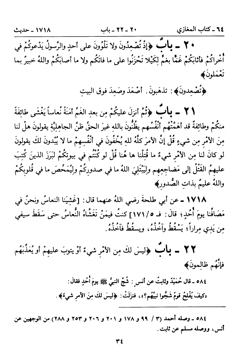 1718 - عن أبي طلحةَ رضي اللهُ عنهما قال: [غَشِيَنَا النُّعَاسُ وَنَحْنُ فِى مَصَافِّنَا يَوْمَ أُحُدٍ؛ قَالَ: فـ 5/ 171] كُنْتُ فِيمَنْ تَغَشَّاهُ النُّعَاسُ حَتَّى سَقَطَ سَيْفِى مِنْ يَدِى مِرَارًا؛ يَسْقُطُ وَآخُذُهُ، وَيَسْقُطُ فَآخُذُهُ.