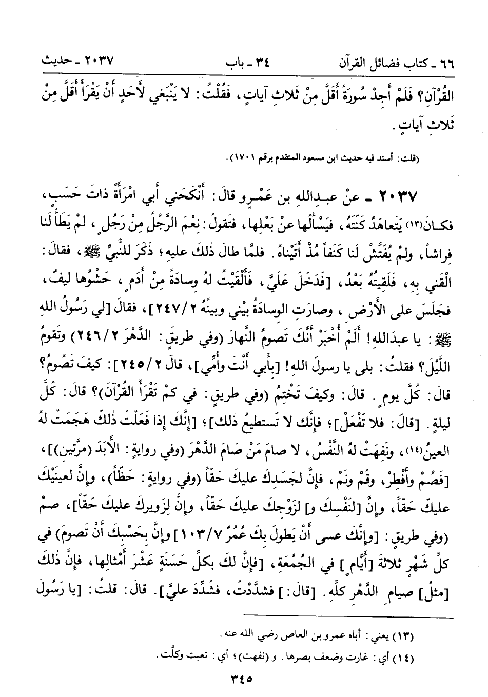 2037 - عَنْ عَبْدِ اللَّهِ بْنِ عَمْرٍو قَالَ: أَنْكَحَنِى أَبِى امْرَأَةً ذَاتَ حَسَبٍ، فَكَانَ (13) يَتَعَاهَدُ كَنَّتَهُ، فَيَسْأَلُهَا عَنْ بَعْلِهَا، فَتَقُولُ: نِعْمَ الرَّجُلُ مِنْ رَجُلٍ، لَمْ يَطَأْ لَنَا فِرَاشًا، وَلَمْ يُفَتِّشْ لَنَا كَنَفًا مُذْ أَتَيْنَاهُ. فَلَمَّا طَالَ ذَلِكَ عَلَيْهِ؛ ذَكَرَ لِلنَّبِىِّ - صلى الله عليه وسلم -، فَقَالَ: الْقَنِى بِهِ, فَلَقِيتُهُ بَعْدُ، [فَدَخَلَ عَلَىَّ، فَأَلْقَيْتُ لَهُ وِسَادَةً مِنْ أَدَمٍ، حَشْوُهَا لِيفٌ، فَجَلَسَ عَلَى الأَرْضِ، وَصَارَتِ الْوِسَادَةُ بَيْنِى وَبَيْنَهُ 2/ 246]، فَقَالَ [لِي رَسُولُ اللهِ - صلى الله عليه وسلم -: يا عبدَ اللهِ! أَلَمْ أُخْبَرْ أَنكَ تَصومُ النَّهارَ (وفي طريقٍ: الدَّهْرَ 2/ 246] وتَقومُ اللَّيْلَ؟ فقلت: بلى يا رسولَ اللهِ! [بِأَبي أَنْتَ وأَمِّي]، قالَ 2/ 245): كَيْفَ تَصُومُ؟ قَالَ: كُلَّ يَوْمٍ. قَالَ: وَكَيْفَ تَخْتِمُ (وفي طريقٍ: في كمْ تَقْرَأُ القُرْآنَ)؟ قَالَ: كُلَّ لَيْلَةٍ. [قالَ: فلا تَفْعَلْ]؛ فإنَّك لا تَستطيعُ ذلك]؛ [إِنَّكَ إِذَا فَعَلْتَ ذَلِكَ هَجَمَتْ لَهُ الْعَيْنُ (14) , وَنَفِهَتْ لَهُ النَّفْسُ، لاَ صَامَ مَنْ صَامَ الدَّهْرَ (وفى روايةٍ: الأَبَدَ (مرَّتينِ)] , [فَصُمْ وَأَفْطِرْ، وَقُمْ وَنَمْ , فَإِنَّ لِجَسَدِكَ عَلَيْكَ حَقًّا (وفي روايةٍ: حَظًّا)، وَإِنَّ لِعَيْنِكَ عَلَيْكَ حَقًّا، وَإِنَّ [لنَفْسِكَ و] لِزَوْجِكَ عَلَيْكَ حَقًّا , وِإن لِزَويركَ عليكَ حَقاً]، صمْ (وفي طريقٍ: [وإنَّكَ عسى أَنْ يَطولَ بِكَ عُمُرٌ 7/ 103] وإنَّ بِحَسْبكَ أَنْ تَصومَ) في كلِّ شَهْرٍ ثلاثةَ [أَيَّامٍ] في الجُمُعَةِ، [فإِنَّ لكَ بكلِّ حَسَنَةٍ عَشْرَ أمثالِها، فإِنَّ ذلكَ [مثلُ]، صيامِ الدَّهْرِ كلِّهِ. [قالَ:] فشدَّدْتُ، فشدِّدَ عليَّ]. قالَ: قلت: [يا رَسُولَ