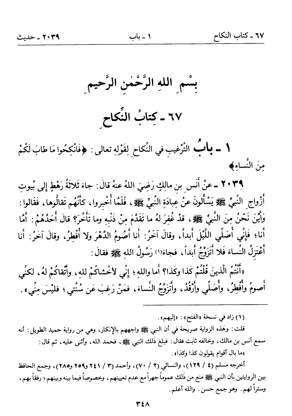 2039 - عنْ أَنَسِ بنِ مالِكٍ رَضِيَ اللهُ عنهُ قالَ: جَاءَ ثَلاَثَةُ رَهْطٍ إِلَى بُيُوتِ أَزْوَاجِ النَّبِيِّ - صلى الله عليه وسلم - يَسْأَلُونَ عَنْ عِبَادِ النَّبِيِّ - صلى الله عليه وسلم -، فَلَمَّا أُخْبِرُوا، كَأَنَّهُمْ تَقَالُّوهَا، فَقَالُوا: وَأَيْنَ نَحْنُ مِنَ النَّبِيِّ - صلى الله عليه وسلم -، قَدْ غُفِرَ لَهُ مَا تَقَدَّمَ مِنْ ذَنْبِهِ وَمَا تَأَخَّرَ؟ قَالَ أَحَدُهُمْ: أَمَّا أَنَا؛ فَإِنِّى أُصَلِّى اللَّيْلَ أَبَدًا، وَقَالَ آخَرُ: أَنَا أَصُومُ الدَّهْرَ وَلاَ أُفْطِرُ، وَقَالَ آخَرُ: أَنَا أَعْتَزِلُ النِّسَاءَ فَلاَ أَتَزَوَّجُ أَبَدًا، فَجَاءَ (1) رَسُولُ اللَّهِ - صلى الله عليه وسلم - فَقَالَ: