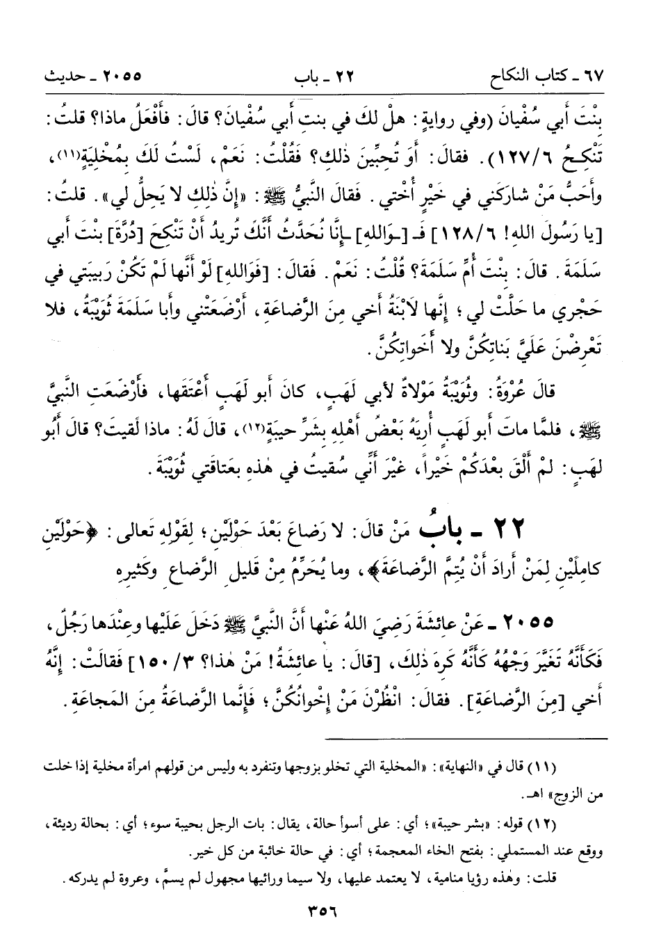 22 - بابُ مَنْ قالَ: لا رَضاعَ بَعْدَ حَوْلَيْنِ؛ لِقَوْلهِ تَعالى: {حَوْلَيْنِ كَامِلَيْنِ لِمَنْ أَرَادَ أَنْ يُتِمَّ الرَّضَاعَةَ}، وما يُحَرِّمُ مِنْ قَليلِ الرَّضاعِ وكَثيرِهِ