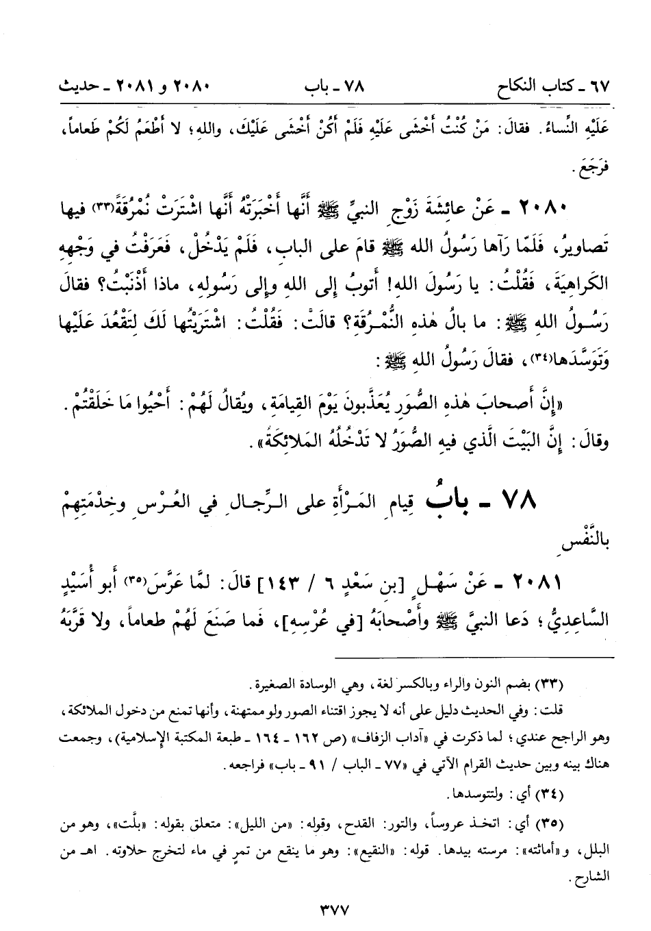 2080 - عَنْ عَائِشَةَ زَوْجِ النَّبِيِّ - صلى الله عليه وسلم - أَنَّهَا أَخْبَرَتْهُ أَنَّهَا اشْتَرَتْ نُمْرُقَةً (33) فِيهَا تَصَاوِيرُ، فَلَمَّا رَآهَا رَسُولُ اللَّهِ - صلى الله عليه وسلم - قَامَ عَلَى الْبَابِ، فَلَمْ يَدْخُلْ، فَعَرَفْتُ فِى وَجْهِهِ الْكَرَاهِيَةَ، فَقُلْتُ: يَا رَسُولَ اللَّهِ! أَتُوبُ إِلَى اللَّهِ وَإِلَى رَسُولِهِ، مَاذَا أَذْنَبْتُ؟ فَقَالَ رَسُولُ اللَّهِ - صلى الله عليه وسلم -: مَا بَالُ هَذِهِ النِّمْرِقَةِ؟ قَالَتْ: فَقُلْتُ: اشْتَرَيْتُهَا لَكَ لِتَقْعُدَ عَلَيْهَا وَتَوَسَّدَهَا (43). فَقَالَ رَسُولُ اللَّهِ - صلى الله عليه وسلم -: