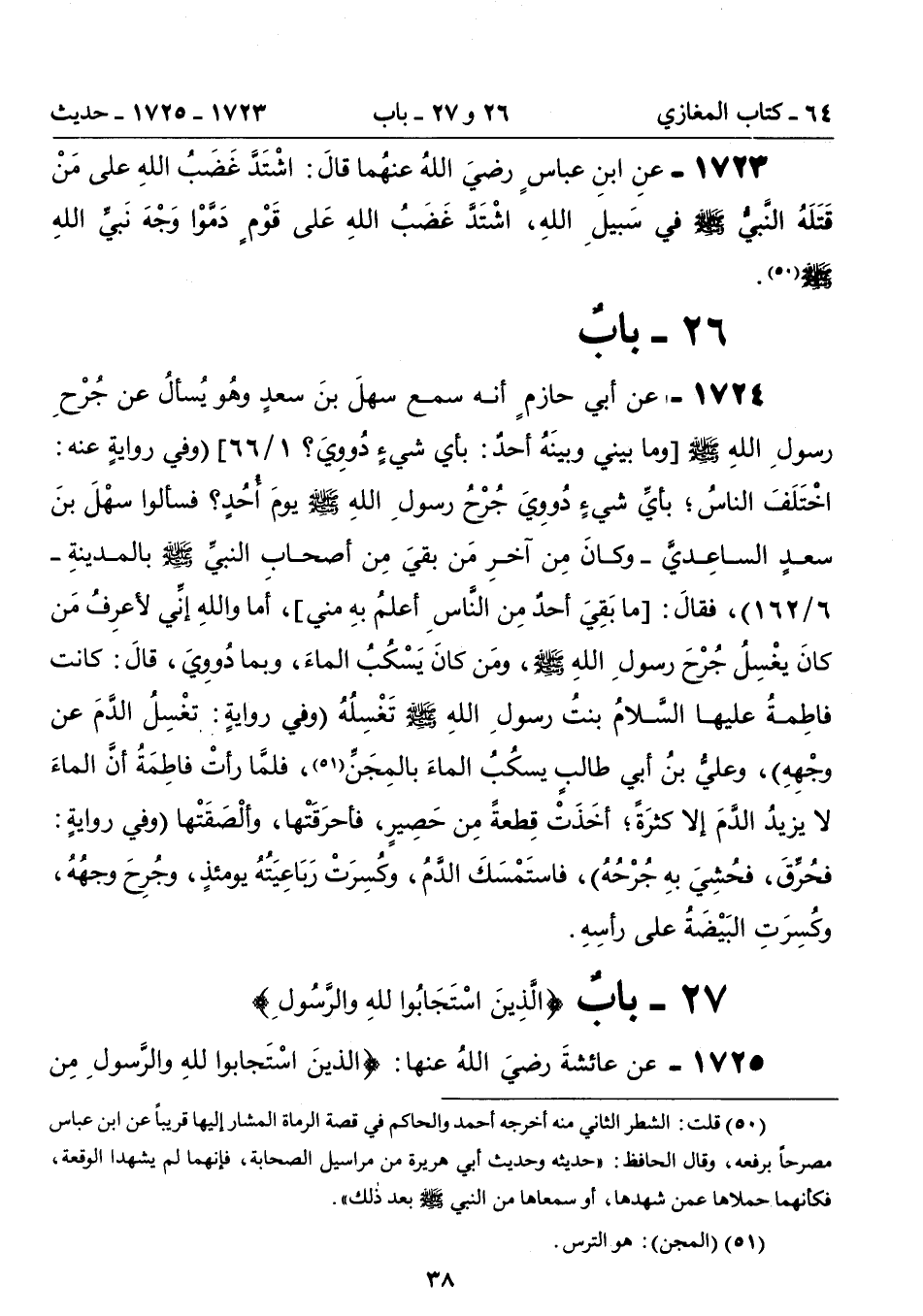 1724 - عَنْ أَبِى حَازِمٍ أَنَّهُ سَمِعَ سَهْلَ بْنَ سَعْدٍ وَهْوَ يُسْأَلُ عَنْ جُرْحِ رَسُولِ اللَّهِ - صلى الله عليه وسلم -[وَمَا بَيْنِى وَبَيْنَهُ أَحَدٌ: بِأَىِّ شَىْءٍ دُووِىَ؟ 1/ 66] (وفي روايةٍ عنه: اخْتَلَفَ النَّاسُ؛ بِأَىِّ شَىْءٍ دُووِىَ جُرْحُ رَسُولِ اللَّهِ - صلى الله عليه وسلم - يَوْمَ أُحُدٍ؟ فَسَأَلُوا سَهْلَ بنَ سعدٍ السَّاعِدِىَّر-وَكَانَ مِنْ آخِرِ مَنْ بَقِىَ مِنْ أَصْحَابِ النَّبِيِّ - صلى الله عليه وسلم - بِالْمَدِينَةِ- 6/ 162]، فَقَالَ: [وَمَا بَقِىَ مِنَ النَّاسِ أَحَدٌ أَعْلَمُ بِهِ مِنِّى]، أما وَاللَّهِ إِنِّى لأَعْرِفُ مَنْ كَانَ يَغْسِلُ جُرْحَ رَسُولِ اللَّهِ - صلى الله عليه وسلم -، وَمَنْ كَانَ يَسْكُبُ الْمَاءَ، وَبِمَا دُووِىَ، قَالَ: كَانَتْ فَاطِمَةُ - عَلَيْهَا السَّلاَمُ - بِنْتُ رَسُولِ اللَّهِ - صلى الله عليه وسلم - تَغْسِلُهُ (وفي روايةٍ: تغْسِلُ الدَّمَ عن وجْهِهِ) , وَعَلِىٌّ بنُ أبي طالبٍ يَسْكُبُ الْمَاءَ بِالْمِجَنِّ (51)، فَلَمَّا رَأَتْ فَاطِمَةُ أَنَّ الْمَاءَ لاَ يَزِيدُ الدَّمَ إِلاَّ كَثْرَةً؛ أَخَذَتْ قِطْعَةً مِنْ حَصِيرٍ، فَأَحْرَقَتْهَا، وَأَلْصَقَتْهَا (وفى روايةٍ: فحُرَّقَ, فحشِىَ بهِ جُرْحُهُ) , فاستَمْسَكَ الدَّمُ، وَكُسِرَتْ رَبَاعِيَتُهُ يَوْمَئِذٍ، وَجُرِحَ وَجْهُهُ، وَكُسِرَتِ الْبَيْضَةُ عَلَى رَأْسِهِ.