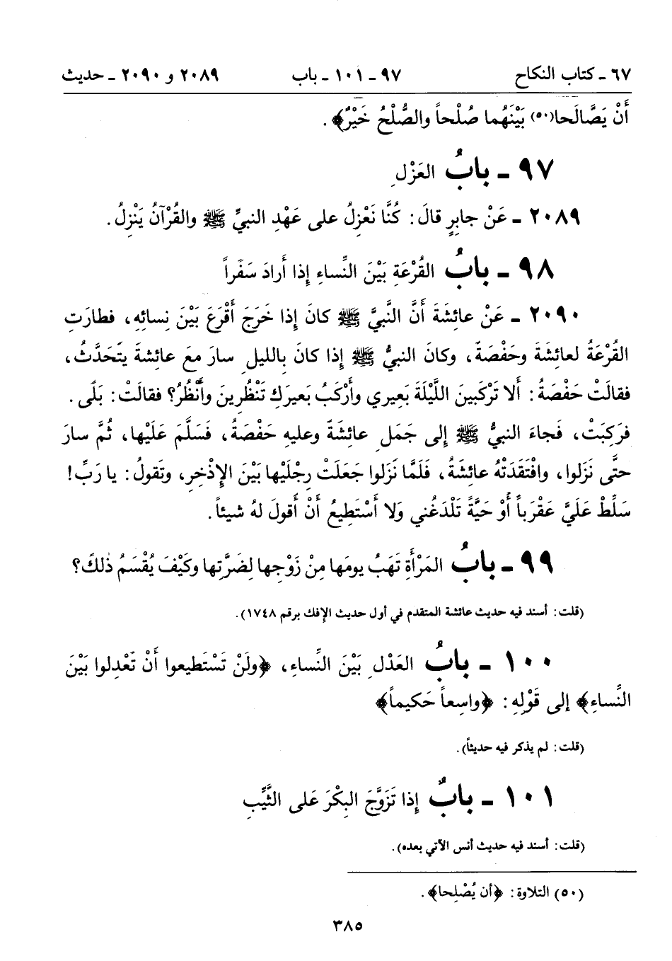 100 - بابُ الْعَدْلِ بَيْنَ النِّسَاءِ، {وَلَنْ تَسْتَطِيعُوا أَنْ تَعْدِلُوا بَيْنَ النِّسَاءِ} إِلَى قَوْلِهِ {وَاسِعًا حَكِيمًا}