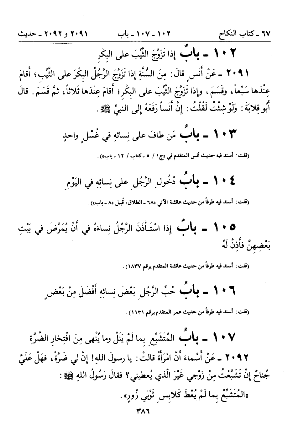 2091 - عَنْ أَنَسٍ قَالَ: مِنَ السُّنَّةِ إِذَا تَزَوَّجَ الرَّجُلُ الْبِكْرَ عَلَى الثَّيِّبِ؛ أَقَامَ عِنْدَهَا سَبْعًا، وَقَسَمَ، وَإِذَا تَزَوَّجَ الثَّيِّبَ عَلَى الْبِكْرِ؛ أَقَامَ عِنْدَهَا ثَلاَثًا، ثُمَّ قَسَمَ. قَالَ أَبُو قِلاَبَةَ: وَلَوْ شِئْتُ لَقُلْتُ: إِنَّ أَنَسًا رَفَعَهُ إِلَى النَّبِيِّ - صلى الله عليه وسلم -.