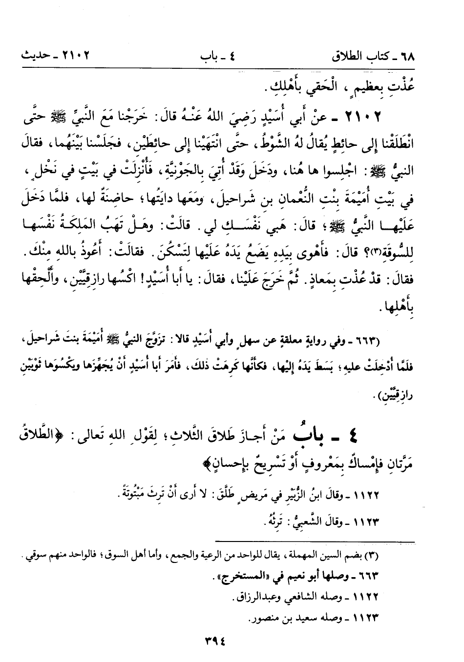 2102 - عَنْ أَبِى أُسَيْدٍ - رضى الله عنه - قَالَ: خَرَجْنَا مَعَ النَّبِيِّ - صلى الله عليه وسلم - حَتَّى انْطَلَقْنَا إِلَى حَائِطٍ يُقَالُ لَهُ الشَّوْطُ، حَتَّى انْتَهَيْنَا إِلَى حَائِطَيْنِ، فَجَلَسْنَا بَيْنَهُمَا، فَقَالَ النَّبِيُّ - صلى الله عليه وسلم -: اجْلِسُوا هَا هُنَا، وَدَخَلَ وَقَدْ أُتِىَ بِالْجَوْنِيَّةِ، فَأُنْزِلَتْ فِى بَيْتٍ فِى نَخْلٍ، فِى بَيْتٍ أُمَيْمَةُ بِنْتُ النُّعْمَانِ بْنِ شَرَاحِيلَ، وَمَعَهَا دَايَتُهَا؛ حَاضِنَةٌ لَهَا، فَلَمَّا دَخَلَ عَلَيْهَا النَّبِيُّ - صلى الله عليه وسلم -؛ قَالَ: هَبِى نَفْسَكِ لِي. قَالَتْ: وَهَلْ تَهَبُ الْمَلِكَةُ نَفْسَهَا لِلسُّوقَةِ (3)؟ قَالَ: فَأَهْوَى بِيَدِهِ يَضَعُ يَدَهُ عَلَيْهَا لِتَسْكُنَ. فَقَالَتْ: أَعُوذُ بِاللَّهِ مِنْكَ. فَقَالَ: قَدْ عُذْتِ بِمَعَاذٍ. ثُمَّ خَرَجَ عَلَيْنَا، فَقَالَ: يَا أَبَا أُسَيْدٍ! اكْسُهَا رَازِقِيَّتَيْنِ، وَأَلْحِقْهَا بِأَهْلِهَا.