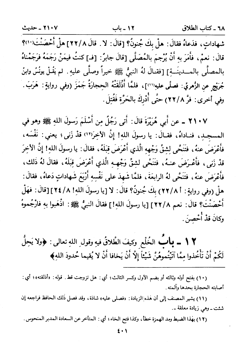 2107 - عن أَبَي هُرَيْرَةَ قَالَ: أَتَى رَجُلٌ مِنْ أَسْلَمَ رَسُولَ اللَّهِ - صلى الله عليه وسلم - وَهْوَ فِى الْمَسْجِدِ، فَنَادَاهُ، فَقَالَ: يَا رَسُولَ اللَّه! إِنَّ الأَخِرَ (12) قَدْ زَنَى؛ يَعْنِى: نَفْسَهُ، فَأَعْرَضَ عَنْهُ، فَتَنَحَّى لِشِقِّ وَجْهِهِ الَّذِى أَعْرَضَ قِبَلَهُ، فَقَالَ: يَا رَسُولَ اللَّهِ! إِنَّ الأَخِرَ قَدْ زَنَى، فَأَعْرَضَ عَنْهُ، فَتَنَحَّى لِشِقِّ وَجْهِهِ الَّذِى أَعْرَضَ قِبَلَهُ، فَقَالَ لَهُ ذَلِكَ، فَأَعْرَضَ عَنْهُ، فَتَنَحَّى لَهُ الرَّابِعَةَ، فَلَمَّا شَهِدَ عَلَى نَفْسِهِ أَرْبَعَ شَهَادَاتٍ دَعَاهُ، فَقَالَ: هَلْ (وفي روايةٍ: أ8/ 22) بِكَ جُنُونٌ؟ قَالَ: لاَ [يا رسولَ اللهِ! 8/ 24] [قالَ: فهَلْ أَحْصَنْتَ؟ قالَ: نعم 8/ 22] [يا رسول الله!] فَقَالَ النَّبِيُّ - صلى الله عليه وسلم -: اذْهَبُوا بِهِ فَارْجُمُوهُ وَكَانَ قَدْ أُحْصِنَ.