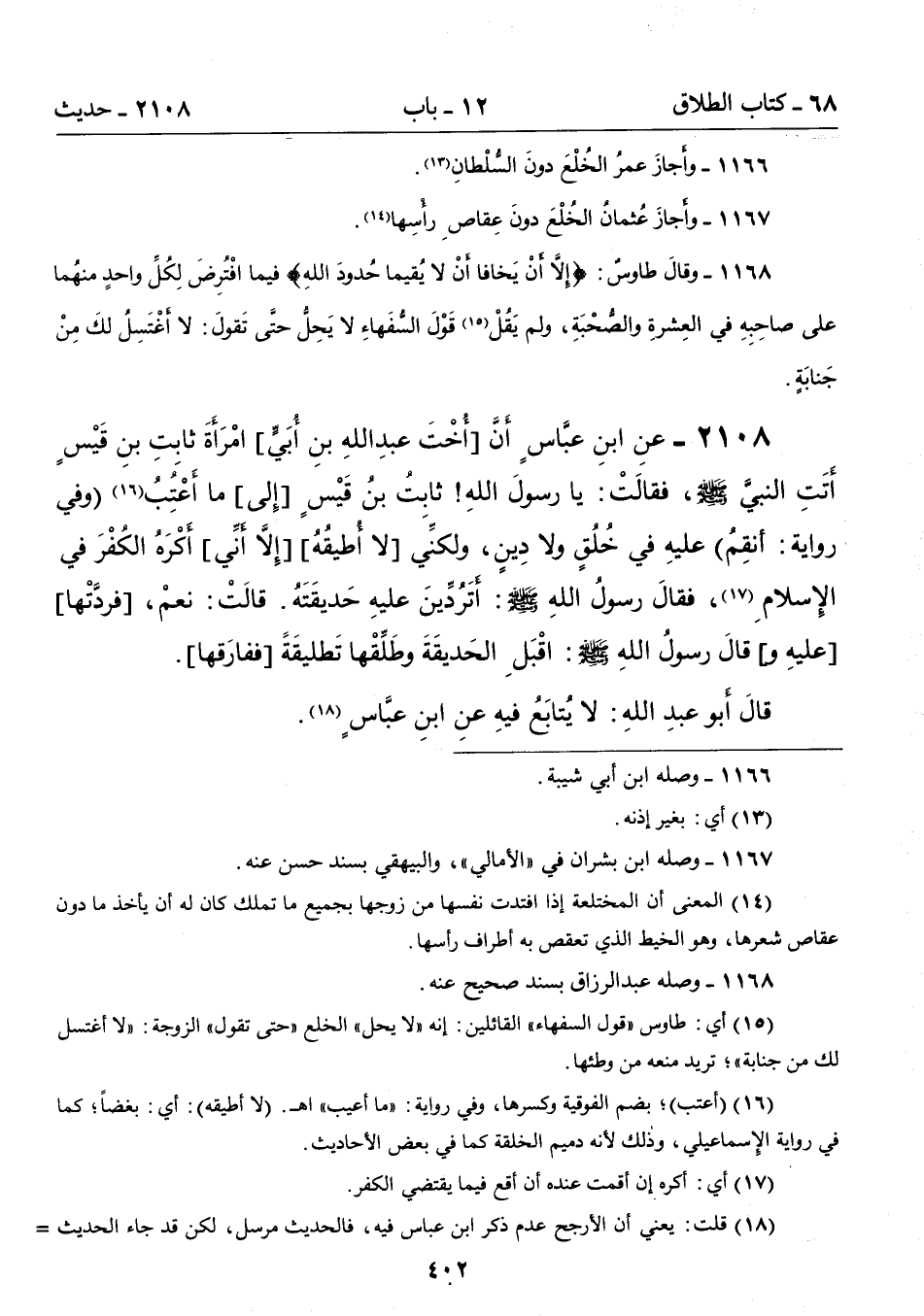 2108 - عَنِ ابْنِ عَبَّاسٍ أَنَّ [أُخْتَ عبدِاللهِ بنِ أُبَيٍّ] امْرَأَةَ ثَابِتِ بْنِ قَيْسٍ أَتَتِ النَّبِيَّ - صلى الله عليه وسلم -، فَقَالَتْ: يَا رَسُولَ اللَّهِ! ثَابِتُ بْنُ قَيْسٍ [إِلى] مَا أَعْتُبُ (16) (وفي روايةٍ: أنقِمُ) عَلَيْهِ فِى خُلُقٍ وَلاَ دِينٍ، وَلَكِنِّى [لا أُطيقُهُ] [إِلاَّ أَنِّي] أَكْرَهُ الْكُفْرَ فِى الإِسْلاَمِ (17)، فَقَالَ رَسُولُ اللَّهِ - صلى الله عليه وسلم -: أَتَرُدِّينَ عَلَيْهِ حَدِيقَتَهُ. قَالَتْ: نَعَمْ، [فردَّتْها] [عليهِ و] قَالَ رَسُولُ اللَّهِ - صلى الله عليه وسلم -: اقْبَلِ الْحَدِيقَةَ وَطَلِّقْهَا تَطْلِيقَةً [ففارَقها].