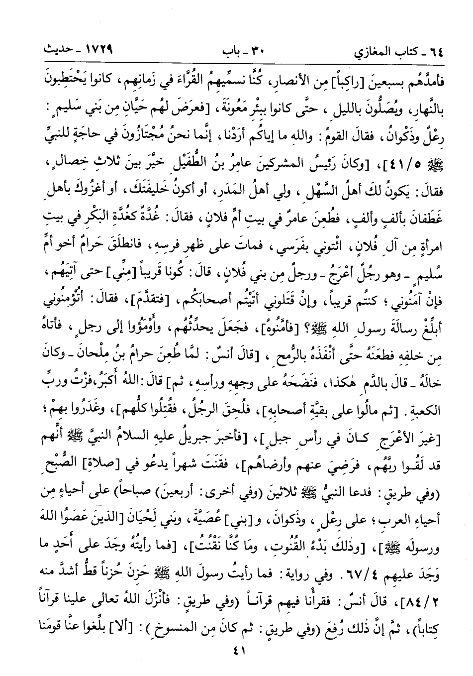 فَأَمَدَّهُمْ بِسَبْعِينَ [راكِباً] مِنَ الأَنْصَارِ، كُنَّا نُسَمِّيهِمُ الْقُرَّاءَ في زَمَانِهِمْ، كَانُوا يَحْتَطِبُونَ بِالنَّهَارِ، وَيُصَلُّونَ بِاللَّيْلِ، حَتَّى كَانُوا بِبِئْرِ مَعُونَةَ، [فَعَرَضَ لَهُمْ حَيَّانِ مِنْ بَنِي سُلَيْمٍ: رِعْلٌ وَذَكْوَانُ، فَقَالَ الْقَوْمُ: وَاللَّهِ مَا إِيَّاكُمْ أَرَدْنَا، إِنَّمَا نَحْنُ مُجْتَازُونَ في حَاجَةٍ لِلنَّبِىِّ - صلى الله عليه وسلم - 5/ 41] , [وَكَانَ رَئِيسَ الْمُشْرِكِينَ عَامِرُ بْنُ الطُّفَيْلِ خَيَّرَ بَيْنَ ثَلاَثِ خِصَالٍ, فَقَالَ: يَكُونُ لَكَ أَهْلُ السَّهْلِ، وَلِى أَهْلُ الْمَدَرِ، أَوْ أَكُونُ خَلِيفَتَكَ، أَوْ أَغْزُوكَ بِأَهْلِ غَطَفَانَ بِأَلْفٍ وَأَلْفٍ، فَطُعِنَ عَامِرٌ في بَيْتِ أُمِّ فُلاَنٍ، فَقَالَ: غُدَّةٌ كَغُدَّةِ الْبَكْرِ في بَيْتِ امْرَأَةٍ مِنْ آلِ فُلاَنٍ, ائْتُونِي بِفَرَسِى, فَمَاتَ عَلَى ظَهْرِ فَرَسِهِ، فَانْطَلَقَ حَرَامٌ أَخُو أُمِّ سُلَيْمٍ -وهُوَ رَجُلٌ أَعْرَجُ- وَرَجُلٌ مِنْ بَنِي فُلاَنٍ قَالَ: كُونَا قَرِيبًا [مِنِّي] حَتَّى آتِيَهُمْ، فَإِنْ آمَنُونِي؛ كُنْتُمْ قريباً، وَإِنْ قَتَلُونِي أَتَيْتُمْ أَصْحَابَكُمْ , [فتقدَّمَ] , فَقَالَ: أَتُؤْمِنُونِي أُبَلِّغْ رِسَالَةَ رَسُولِ اللَّهِ - صلى الله عليه وسلم؟ [فأمَّنُوهُ] , فَجَعَلَ يُحَدِّثُهُمْ ,وَأَوْمَؤُوا إِلَى رَجُلٍ، فَأَتَاهُ مِنْ خَلْفِهِ فَطَعَنَهُ حَتَّى أَنْفَذَهُ بِالرُّمْحِ, [قال أنسُ: لَمَّا طُعِنَ حَرَامُ بْنُ مِلْحَانَ -وَكَانَ خَالَهُ- قَالَ: بِالدَّمِ هَكَذَا، فَنَضَحَهُ عَلَى وَجْهِهِ وَرَأْسِهِ، ثُمَّ] قَالَ: اللهُ أَكبَرُ , فُزْتُ وَرَبِّ الْكَعْبَةِ. [ثم مالُوا على بقيَّةِ أصحابِةِ] , فلُحِقَ الرجُلُ , فقُتِلُوا كلُّهم] , وَغَدَرُوا بِهِمْ؛ [غيْرَ الأَعْرَجِ كَانَ في رَأْسِ جَبَلٍ] , [فَأَخْبَرَ جِبْرِيلُ -عَلَيْهِ السَّلاَمُ - النَّبِيَّ - صلى الله عليه وسلم - أَنَّهُمْ قَدْ لَقُوا رَبَّهُمْ، فَرَضِىَ عَنْهُمْ وَأَرْضَاهُمْ]، فَقَنَتَ شَهْرًا يَدْعُو في [صلاةِ] الصُّبح (وفي طريقٍ: فدعا النبيُّ - صلى الله عليه وسلم - ثلاثينَ (وفي أخرى: أربعينَ) صباحاً) عَلَى أَحْيَاءٍ مِنْ أَحْيَاءِ الْعَرَبِ؛ عَلَى رِعْلٍ، وَذَكْوَانَ، و [بَنى] عُصَيَّةَ , وَبَنِي لَحْيَانَ [الَّذِينَ عَصَوًا اللَّهَ وَرَسُولَهُ - صلى الله عليه وسلم] , [وَذَلِكَ بَدْءُ الْقُنُوتِ، وَمَا كُنَّا نَقْنُتُ] , [فَمَا رَأَيْتُهُ وَجَدَ عَلَى أَحَدٍ مَا وَجَدَ عَلَيْهِمْ 4/ 67. وفي روايةٍ: فَمَا رَأَيْتُ رَسُولَ اللَّهِ - صلى الله عليه وسلم - حَزِنَ حُزْنًا قَطُّ أَشَدَّ مِنْهُ 2/ 84] , قالَ أنسٌ: فَقَرَأْنَا فِيهِمْ قُرْآنًا (وفي طريقٍ: فأنزَلَ اللهُ تعالى علينا قرآناً كِتاباً) , ثُمِّ إِنَّ ذَلِكَ رُفِعَ (وفي طريقٍ: ثم كان مِن المنسوخِ): [ألا] بَلِّغُوا عَنَّا قَوْمَنَا