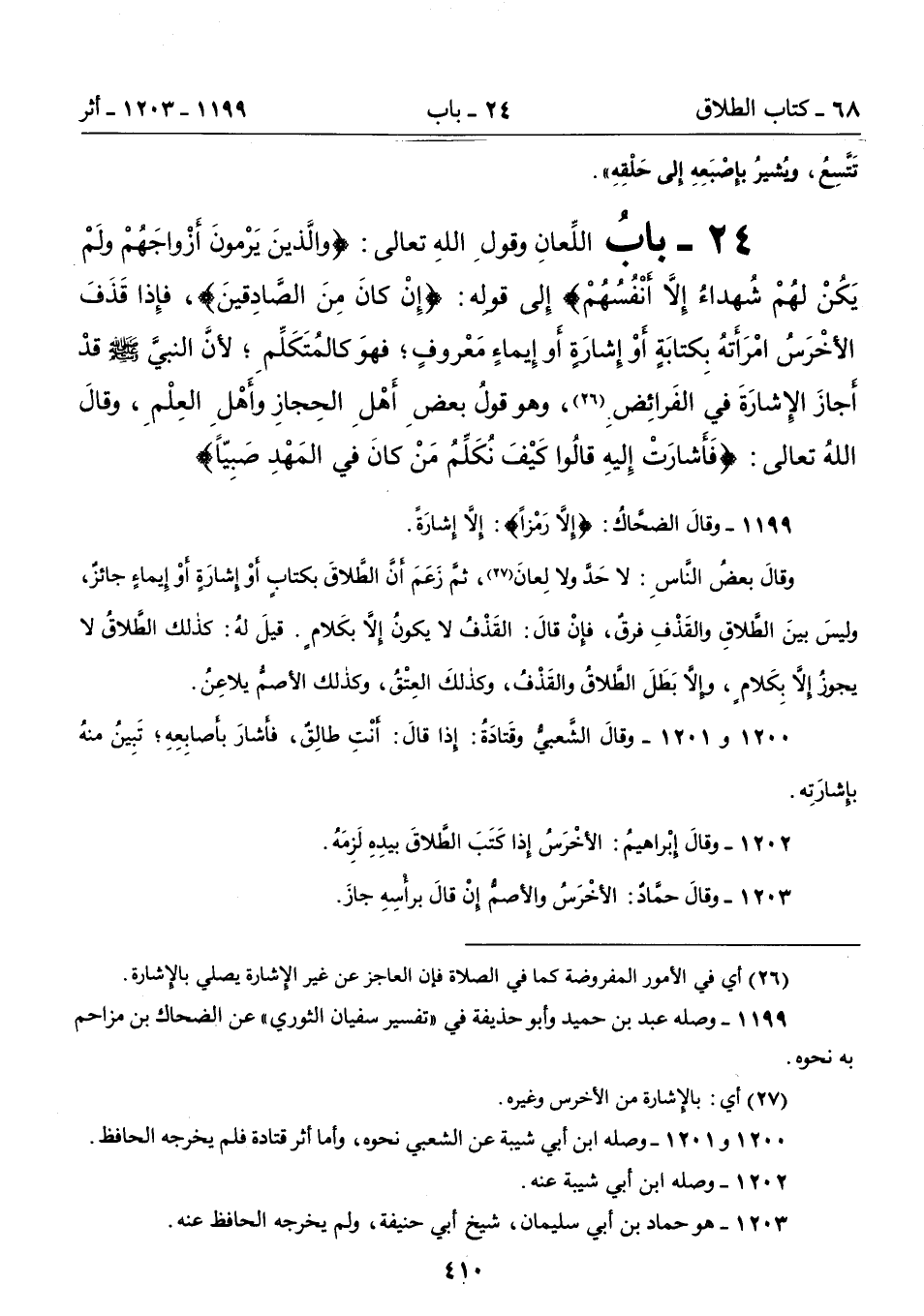 24 - باب اللِّعَانِ وَقَوْلِ اللَّهِ تَعَالَى: {وَالَّذِينَ يَرْمُونَ أَزْوَاجَهُمْ وَلَمْ يَكُنْ لَهُمْ شُهَدَاءُ إِلاَّ أَنْفُسُهُمْ} إِلَى قَوْلِهِ {إِنْ كَانَ مِنَ الصَّادِقِينَ}، فَإِذَا قَذَفَ الأَخْرَسُ امْرَأَتَهُ بِكِتَابَةٍ أَوْ إِشَارَةٍ أَوْ بِإِيمَاءٍ مَعْرُوفٍ؛ فَهْوَ كَالْمُتَكَلِّمِ؛ لأَنَّ النَّبِيَّ - صلى الله عليه وسلم - قَدْ أَجَازَ الإِشَارَةَ فِى الْفَرَائِضِ (26)، وَهْوَ قَوْلُ بَعْضِ أَهْلِ الْحِجَازِ وَأَهْلِ الْعِلْمِ، وَقَالَ اللَّهُ تَعَالَى {فَأَشَارَتْ إِلَيْهِ قَالُوا كَيْفَ نُكَلِّمُ مَنْ كَانَ فِى الْمَهْدِ صَبِيًّا}.