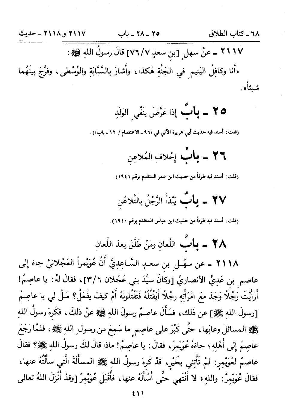 2118 - عن سَهْلِ بْنَ سَعْدٍ السَّاعِدِىَّ أَنَّ عُوَيْمِرًا الْعَجْلاَنِىَّ جَاءَ إِلَى عَاصِمِ بْنِ عَدِىٍّ الأَنْصَارِىِّ [وكان سيِّدَ بني عَجْلان 6/ 3]، فَقَالَ لَهُ: يَا عَاصِمُ! أَرَأَيْتَ رَجُلاً وَجَدَ مَعَ امْرَأَتِهِ رَجُلاً أَيَقْتُلُهُ فَتَقْتُلُونَهُ أَمْ كَيْفَ يَفْعَلُ؟ سَلْ لِي يَا عَاصِمُ [رسول الله - صلى الله عليه وسلم -] عَنْ ذَلِكَ، فَسَأَلَ عَاصِمٌ رَسُولَ اللَّهِ - صلى الله عليه وسلم - عَنْ ذَلِكَ، فَكَرِهَ رَسُولُ اللَّهِ - صلى الله عليه وسلم - الْمَسَائِلَ وَعَابَهَا، حَتَّى كَبُرَ عَلَى عَاصِمٍ مَا سَمِعَ مِنْ رَسُولِ اللَّهِ - صلى الله عليه وسلم -، فَلَمَّا رَجَعَ عَاصِمٌ إِلَى أَهْلِهِ؛ جَاءَهُ عُوَيْمِرٌ، فَقَالَ: يَا عَاصِمُ! مَاذَا قَالَ لَكَ رَسُولُ اللَّهِ - صلى الله عليه وسلم -؟ فَقَالَ عَاصِمٌ لِعُوَيْمِرٍ: لَمْ تَأْتِنِى بِخَيْرٍ، قَدْ كَرِهَ رَسُولُ اللَّهِ - صلى الله عليه وسلم - الْمَسْأَلَةَ الَّتِى سَأَلْتُهُ عَنْهَا، فَقَالَ عُوَيْمِرٌ: وَاللَّهِ؛ لاَ أَنْتَهِى حَتَّى أَسْأَلَهُ عَنْهَا، فَأَقْبَلَ عُوَيْمِرٌ [وقد أَنْزَلَ اللهُ تعالى