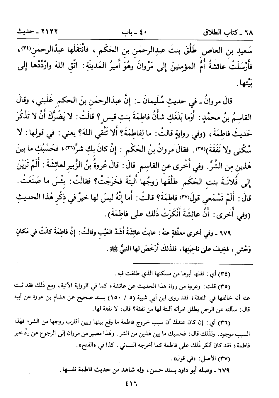 قَالَ: مَرْوَانُ -فِى حَدِيثِ سُلَيْمَانَ-: إِنَّ عَبْدَ الرَّحْمَنِ بْنَ الْحَكَمِ غَلَبَنِى، وَقَالَ الْقَاسِمُ بْنُ مُحَمَّدٍ: أَوَمَا بَلَغَكِ شَأْنُ فَاطِمَةَ بِنْتِ قَيْسٍ؟ قَالَتْ: لاَ يَضُرُّكَ أَنْ لاَ تَذْكُرَ حَدِيثَ فَاطِمَةَ، (وفي روايةٍ قالتْ: ما لِفاطِمَةَ؟ ألا تَتَّقي الله؟ يعني: في قولِها: لا سُكْنى ولا نفَقَةَ) (35). فَقَالَ مَرْوَانُ بْنُ الْحَكَمِ: إِنْ كَانَ بِكِ شَرٌّ (36)؛ فَحَسْبُكِ مَا بَيْنَ هَذَيْنِ مِنَ الشَّرِّ. وفي أُخْرى عنِ القاسِمِ قالَ: قالَ عُروةُ بنُ الزبيرِ لعائِشَةَ: أَلَمْ تَرَيْنَ إِلَى فُلاَنَةَ بِنْتِ الْحَكَمِ طَلَّقَهَا زَوْجُهَا ألْبَتَّةَ فَخَرَجَتْ؟ فَقَالَتْ: بِئْسَ مَا صَنَعَتْ. قَالَ: أَلَمْ تَسْمَعِى قَوْلَ (37) فَاطِمَةَ؟ قَالَتْ: أَمَا إِنَّهُ لَيْسَ لَهَا خَيْرٌ فِى ذِكْرِ هَذَا الْحَدِيثِ. (وفي أُخرى: أَنَّ عائِشَةَ أنْكَرَتْ ذلك على فاطِمَةَ).