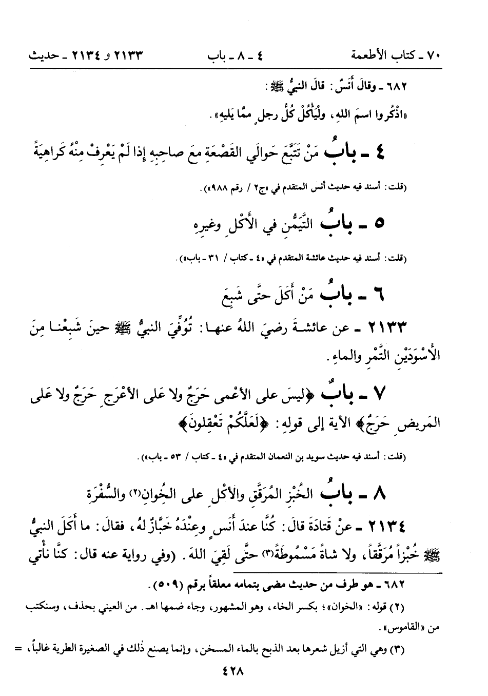 2134 - عَنْ قَتَادَةَ قَالَ: كُنَّا عِنْدَ أَنَسٍ وَعِنْدَهُ خَبَّازٌ لَهُ، فَقَالَ: مَا أَكَلَ النَّبِيُّ - صلى الله عليه وسلم - خُبْزًا مُرَقَّقَّا، وَلاَ شَاةً مَسْمُوطَةً (3) حَتَّى لَقِىَ اللَّهَ. (وفي رواية عنه قال: كنَّا نأْتي