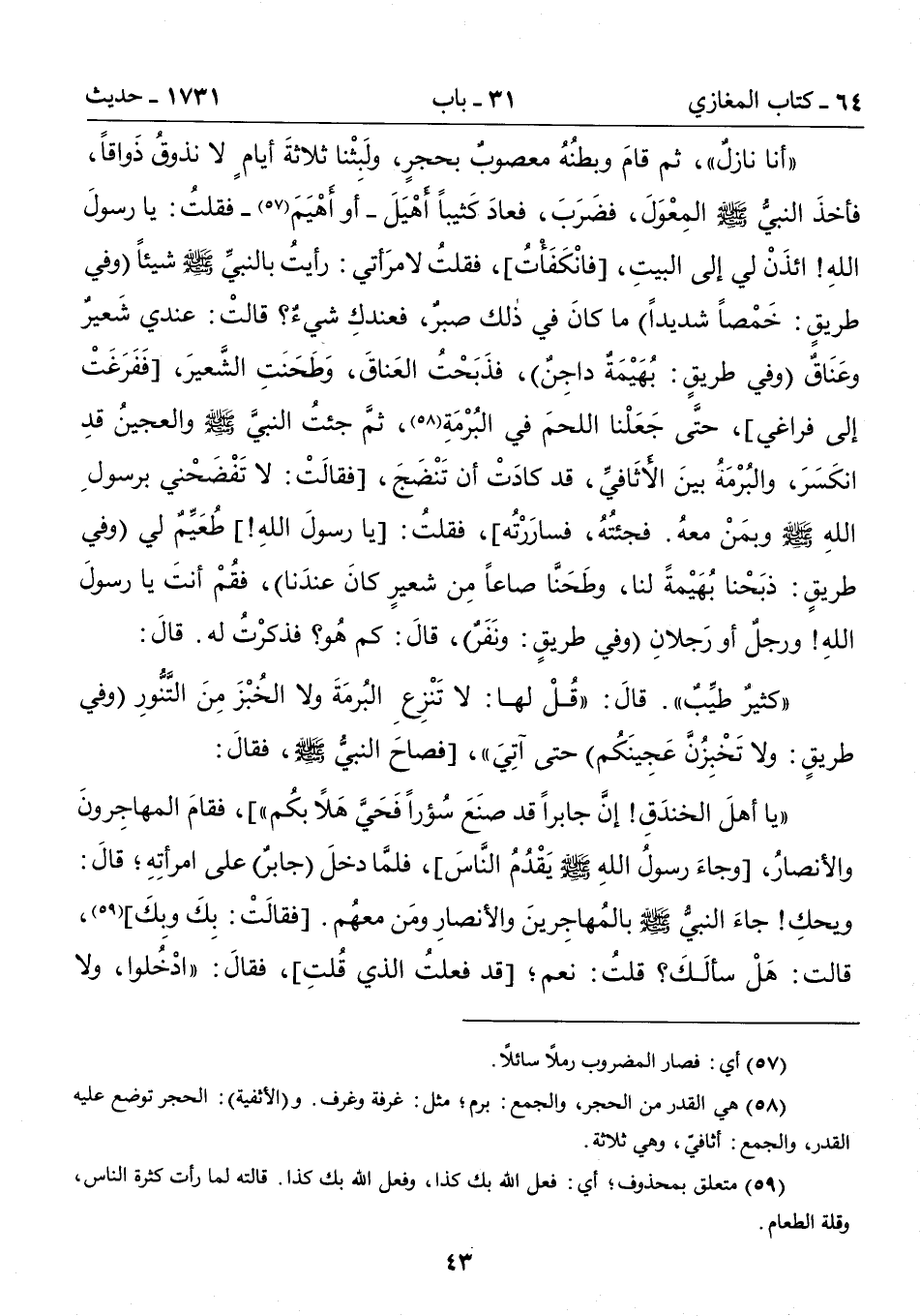 «أَنَا نَازِلٌ» , ثُمَّ قَامَ وَبَطْنُهُ مَعْصُوبٌ بِحَجَرٍ، وَلَبِثْنَا ثَلاَثَةَ أَيَّامٍ لاَ نَذُوقُ ذَوَاقَّا، فَأَخَذَ النَّبِىُّ - صلى الله عليه وسلم - الْمِعْوَلَ، فَضَرَبَ، فَعَادَ كَثِيبًا أَهْيَلَ -أَوْ أَهْيَمَ (57) - فَقُلْتُ: يَا رَسُولَ اللَّهِ! ائْذَنْ لِي إِلَى الْبَيْتِ. [فانْكَفَأتُ] , فَقُلْتُ لاِمْرَأَتِى: رَأَيْتُ بِالنَّبِىِّ - صلى الله عليه وسلم - شَيْئًا (وفي طريق: خَمْصاً شديداً) مَا كَانَ فِى ذَلِكَ صَبْرٌ، فَعِنْدَكِ شَىْءٌ؟ قَالَتْ: عِنْدِى شَعِيرٌ وَعَنَاقٌ (وفي طريقٍ: بُهَيْمَةٌ داجِنٌ) , فَذَبَحْتُ الْعَنَاقَ، وَطَحَنَتِ الشَّعِيرَ، [فَفَرغَتْ إلى فراغى]، حَتَّى جَعَلْنَا اللَّحْمَ فِى الْبُرْمَةِ (58)، ثُمَّ جِئْتُ النَّبِيَّ - صلى الله عليه وسلم - وَالْعَجِينُ قَدِ انْكَسَرَ، وَالْبُرْمَةُ بَيْنَ الأَثَافِىِّ، قَدْ كَادَتْ أَنْ تَنْضَجَ، [فَقَالَتْ: لاَ تَفْضَحْنِى بِرَسُولِ اللَّهِ - صلى الله عليه وسلم - وَبِمَنْ مَعَهُ. فَجِئْتُهُ، فَسَارَرْتُهُ] , فَقُلْتُ: [يا رسولَ اللهِ!] طُعَيِّمٌ لِي (وفي طريقٍ: ذَبَحْنَا بُهَيْمَةً لَنَا، وَطَحَنْتُ صَاعًا مِنْ شَعِيرٍ كانَ عندَنا) , فَقُمْ أَنْتَ يَا رَسُولَ اللَّهِ! وَرَجُلٌ أَوْ رَجُلاَنِ (وفى طريقٍ: نَفَرٌ) , قالَ: كَمْ هُوَ؟ فَذَكَرْتُ لَهُ. قَالَ: