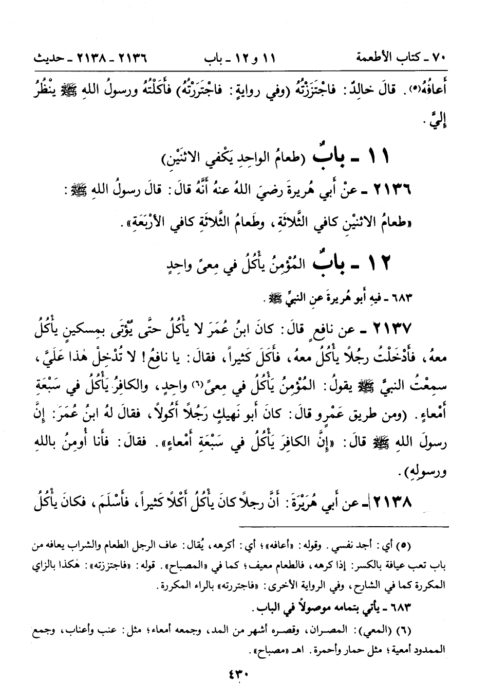 2138 - عَنْ أَبِى هُرَيْرَةَ: أَنَّ رَجُلاً كَانَ يَأْكُلُ أَكْلاً كَثِيرًا، فَأَسْلَمَ فَكَانَ يَأْكُلُ