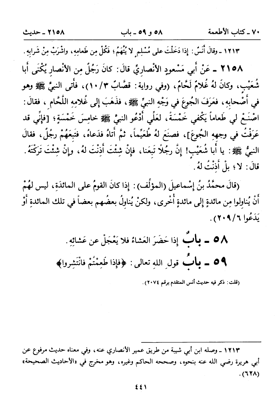 2158 - عَنْ أَبُو مَسْعُودٍ الأَنْصَارِىُّ قَالَ: كَانَ رَجُلٌ مِنَ الأَنْصَارِ يُكْنَى أَبَا شُعَيْبٍ، وَكَانَ لَهُ غُلاَمٌ لَحَّامٌ، (وفي روايةٍ: قصَّابُ 3/ 10)، فأَتَى النَّبىَّ - صلى الله عليه وسلم - وَهْوَ فِى أَصْحَابِهِ، فَعَرَفَ الْجُوعَ فِى وَجْهِ النَّبِيِّ - صلى الله عليه وسلم -، فَذَهَبَ إِلَى غُلاَمِهِ اللَّحَّامِ، فَقَالَ: اصْنَعْ لِي طَعَامًا يَكْفِي خَمْسَةً، لَعَلِّي أَدْعُو النَّبِيَّ - صلى الله عليه وسلم - خَامِسَ خَمْسَةٍ؛ [فإنِّي قد عَرَفْتُ في وجههِ الجُوعَ]، فَصَنَعَ لَهُ طُعَيِّمًا، ثُمَّ أَتَاهُ فَدَعَاهُ، فَتَبِعَهُمْ رَجُلٌ، فَقَالَ النَّبِيُّ - صلى الله عليه وسلم -: يَا أَبَا شُعَيْبٍ! إِنَّ رَجُلاً تَبِعَنَا، فَإِنْ شِئْتَ أَذِنْتَ لَهُ، وَإِنْ شِئْتَ تَرَكْتَهُ. قَالَ: لاَ بَلْ أَذِنْتُ لَهُ.