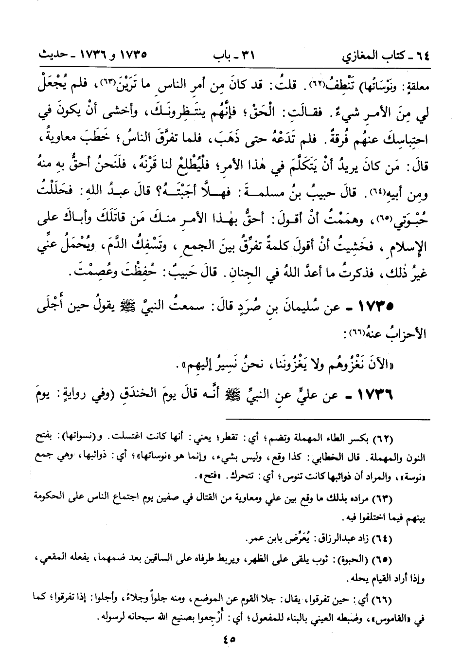 معلقةٍ: ونَوْسَاتُها) تَنْطِفُ (62). قلتُ: قَدْ كَانَ مِنْ أَمْرِ النَّاسِ مَا تَرَيْنَ (63)، فَلَمْ يُجْعَلْ لِي مِنَ الأَمْرِ شَىْءٌ. فَقَالَتِ الْحَقْ؛ فَإِنَّهُمْ يَنْتَظِرُونَكَ، وَأَخْشَى أَنْ يَكُونَ فِى احْتِبَاسِكَ عَنْهُمْ فُرْقَةٌ. فَلَمْ تَدَعْهُ حَتَّى ذَهَبَ، فَلَمَّا تَفَرَّقَ النَّاسُ؛ خَطَبَ مُعَاوِيَةُ، قَالَ: مَنْ كَانَ يُرِيدُ أَنْ يَتَكَلَّمَ فِى هَذَا الأَمْرِ؛ فَلْيُطْلِعْ لَنَا قَرْنَهُ، فَلَنَحْنُ أَحَقُّ بِهِ مِنْهُ وَمِنْ أَبِيه (64). قَالَ حَبِيبُ بْنُ مَسْلَمَةَ: فَهَلاَّ أَجَبْتَهُ؟ قَالَ عَبْدُ اللَّهِ: فَحَلَلْتُ حُبْوَتِى (65)، وَهَمَمْتُ أَنْ أَقُولَ: أَحَقُّ بِهَذَا الأَمْرِ مِنْكَ مَنْ قَاتَلَكَ وَأَبَاكَ عَلَى الإِسْلاَمِ، فَخَشِيتُ أَنْ أَقُولَ كَلِمَةً تُفَرِّقُ بَيْنَ الْجَمْعِ، وَتَسْفِكُ الدَّمَ، وَيُحْمَلُ عَنِّى غَيْرُ ذَلِكَ، فَذَكَرْتُ مَا أَعَدَّ اللَّهُ فِى الْجِنَانِ. قَالَ حَبِيبٌ: حُفِظْتَ وَعُصِمْتَ.