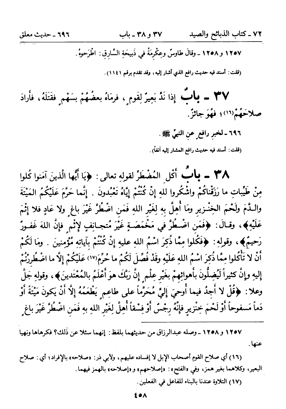 37 - بابٌ إِذَا نَدَّ بَعِيرٌ لِقَوْمٍ، فَرَمَاهُ بَعْضُهُمْ بِسَهْمٍ فَقَتَلَهُ، فَأَرَادَ إِصْلاَحَهُمْ (16)؛ فَهْوَ جَائِزٌ.
