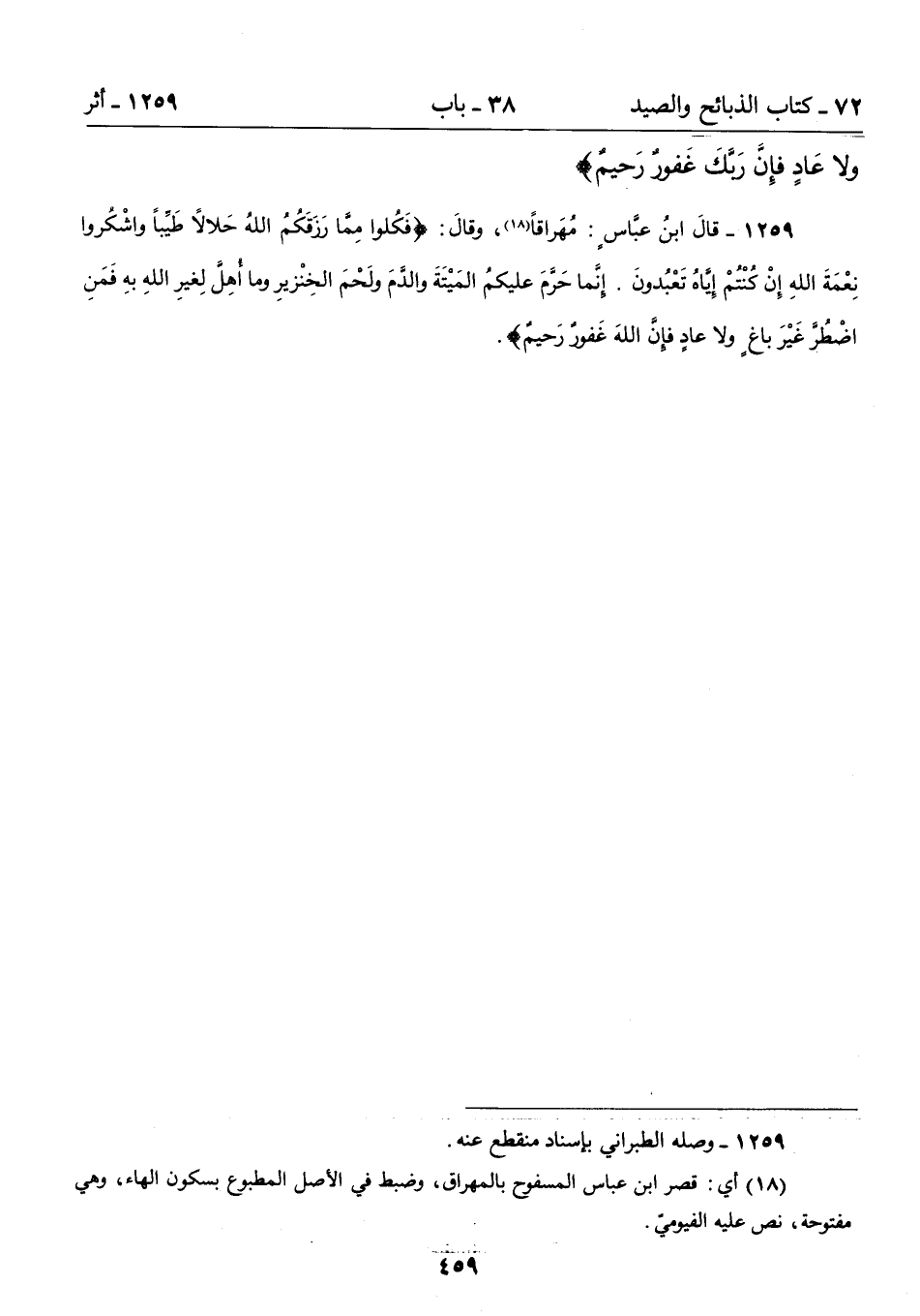 1259 - قالَ ابنُ عبَّاسٍ: مُهَراقاً (18)، وقالَ: {فَكُلُوا مِمَّا رَزَقَكُمُ اللَّهُ حَلاَلاً طَيِّبًا وَاشْكُرُوا نِعْمَةَ اللَّهِ إِنْ كُنْتُمْ إِيَّاهُ تَعْبُدُونَ. إِنَّمَا حَرَّمَ عَلَيْكُمُ الْمَيْتَةَ وَالدَّمَ وَلَحْمَ الْخِنْزِيرِ وَمَا أُهِلَّ لِغَيْرِ اللَّهِ بِهِ فَمَنِ اضْطُرَّ غَيْرَ بَاغٍ وَلاَ عَادٍ فَإِنَّ اللَّهَ غَفُورٌ رَحِيمٌ).