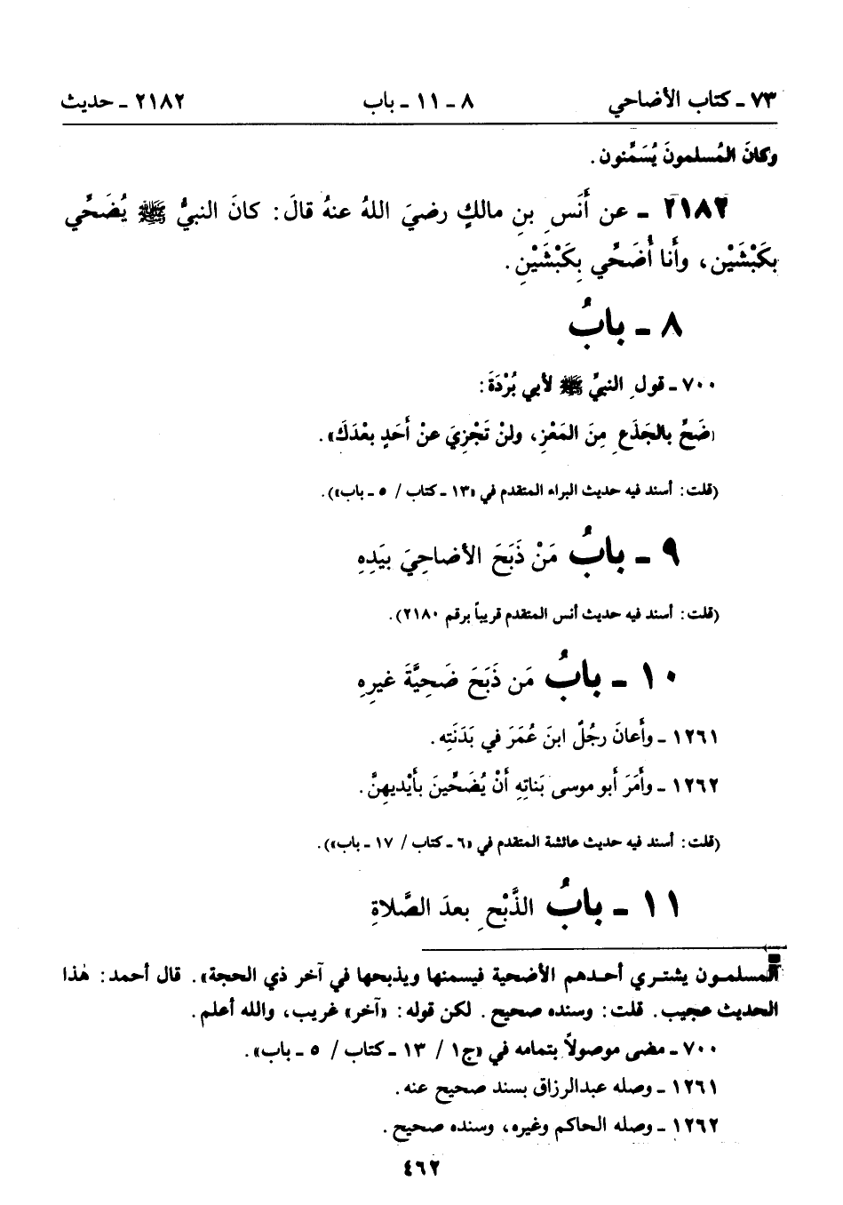 2182 - عن أنَسِ بنِ مالكٍ رضيَ اللهُ عنهُ قَالَ: كَانَ النَّبِيُّ - صلى الله عليه وسلم - يُضَحِّى بِكَبْشَيْنِ، وَأَنَا أُضَحِّى بِكَبْشَيْنِ.