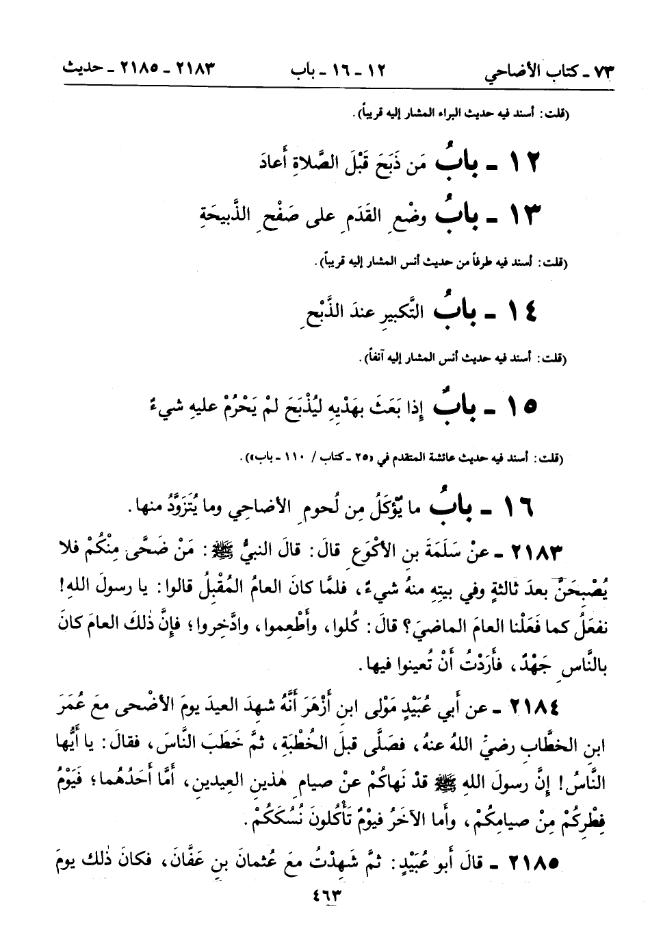 2183 - عنْ سلَمَةَ بنِ الأكْوَعِ قالَ: قالَ النبيُّ - صلى الله عليه وسلم -: مَنْ ضَحَّى مِنْكُمْ فلا يُصْبِحَنَّ بعدَ ثالثةٍ وفي بيتِهِ منهُ شيءٌ، فلمَّا كانَ العامُ المُقْبِلُ قالوا: يا رسولَ اللهِ! نفعَلُ كما فَعَلْنا العامَ الماضيَ؟ قالَ: كُلوا، وأَطْعِموا، وادَّخِروا؛ فإِنَّ ذلكَ العامَ كانَ بالنَّاسِ جَهْدٌ، فأرَدْتُ أنْ تُعينوا فيها.