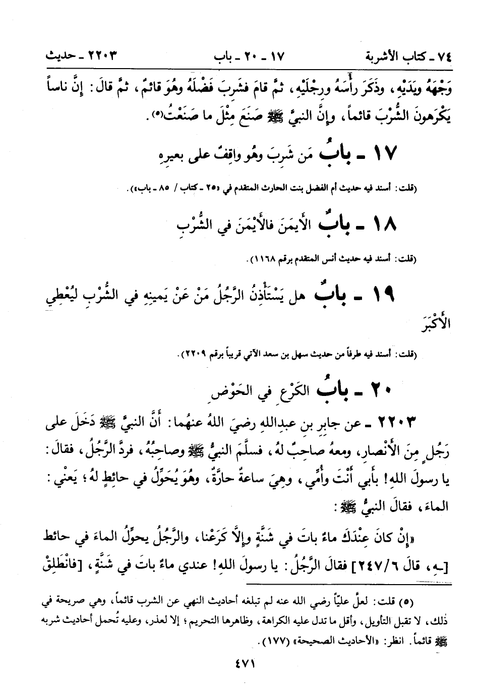 (5) قلت: لعلَّ علياً رضي الله عنه لم تبلغه أحاديث النهي عن الشرب قائماً، وهي صريحة في ذلك، لا تقبل التأويل، وأقل ما تدل عليه الكراهة، وظاهرها التحريم؛ إلا لعذر، وعليه تُحمل أحاديث شربه - صلى الله عليه وسلم - قائماً. انظر: "الأحاديث الصحيحة" (177).