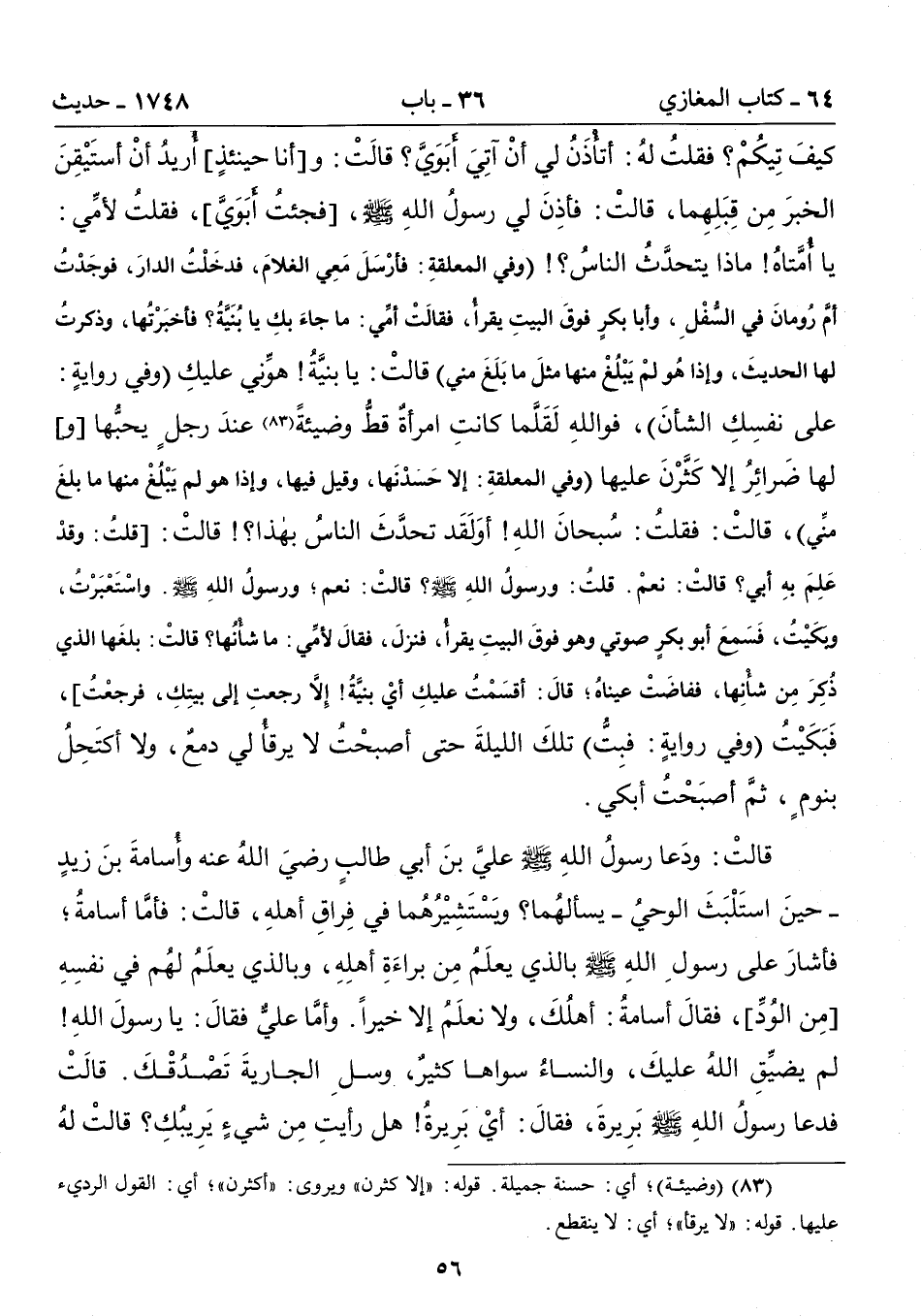 كَيْفَ تِيكُمْ؟ فَقُلْتُ لَهُ: أَتَأْذَنُ لِي أَنْ آتِىَ أَبَوَىَّ؟ قَالَتْ: و [أنا حينئذٍ] أُرِيدُ أَنْ أَسْتَيْقِنَ الْخَبَرَ مِنْ قِبَلِهِمَا، قَالَتْ: فَأَذِنَ لِي رَسُولُ اللَّهِ - صلى الله عليه وسلم -، [فجئتُ أَبَوَيَّ] , فَقُلْتُ لأُمِّى: يَا أُمَّتَاهُ! مَاذَا يَتَحَدَّثُ النَّاسُ؟! (وفى المعلقة: فَأَرْسَلَ مَعِى الْغُلاَمَ، فَدَخَلْتُ الدَّارَ، فَوَجَدْتُ أُمَّ رُومَانَ فِى السُّفْلِ، وَأَبَا بَكْرٍ فَوْقَ الْبَيْتِ يَقْرَأُ، فَقَالَتْ أُمِّى: مَا جَاءَ بِكِ يَا بُنَيَّةُ؟ فَأَخْبَرْتُهَا، وَذَكَرْتُ لَهَا الْحَدِيثَ، وَإِذَا هُوَ لَمْ يَبْلُغْ مِنْهَا مِثْلَ مَا بَلَغَ مِنِّى) قَالَتْ: يَا بُنَيَّةُ! هَوِّنِى عَلَيْكِ (وفى روايةٍ: على نفسِكِ الشأنَ)، فَوَاللَّهِ لَقَلَّمَا كَانَتِ امْرَأَةٌ قَطُّ وَضِيئَةً (83) عِنْدَ رَجُلٍ يُحِبُّهَا [و] لَهَا ضَرَائِرُ إِلاَّ كَثَّرْنَ عَلَيْهَا (وفى المعلقة: إِلاَّ حَسَدْنَهَا، وَقِيلَ فِيهَا، وَإِذَا هُوَ لَمْ يَبْلُغْ مِنْهَا مَا بَلَغَ مِنِّى)، قَالَتْ: فَقُلْتُ: سُبْحَانَ اللَّهِ! أَوَلَقَدْ تَحَدَّثَ النَّاسُ بِهَذَا؟! قَالَتْ: [قُلْتُ: وَقَدْ عَلِمَ بِهِ أَبِى؟ قَالَتْ: نَعَمْ. قُلْتُ: وَرَسُولُ اللَّهِ - صلى الله عليه وسلم -؟ قَالَتْ: نَعَمْ؛ وَرَسُولُ اللَّهِ - صلى الله عليه وسلم - وَاسْتَعْبَرْتُ، وَبَكَيْتُ، فَسَمِعَ أَبُو بَكْرٍ صَوْتِى وَهْوَ فَوْقَ الْبَيْتِ يَقْرَأُ، فَنَزَلَ، فَقَالَ لأُمِّى: مَا شَأْنُهَا؟ قَالَتْ: بَلَغَهَا الَّذِى ذُكِرَ مِنْ شَأْنِهَا، فَفَاضَتْ عَيْنَاهُ؛ قَالَ: أَقْسَمْتُ عَلَيْكِ أَىْ بُنَيَّةُ! إِلاَّ رَجَعْتِ إِلَى بَيْتِكِ، فَرَجَعْتُ]، فَبَكَيْتُ (وفى روايةٍ: فبِتُّ) تِلْكَ اللَّيْلَةَ حَتَّى أَصْبَحْتُ لاَ يَرْقَأُ لِي دَمْعٌ، وَلاَ أَكْتَحِلُ بِنَوْمٍ، ثُمَّ أَصْبَحْتُ أَبْكِى.