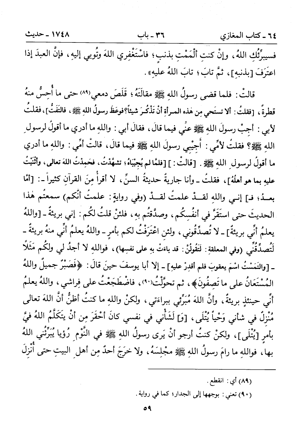 فسيبرِّئُكِ اللهُ، وإنْ كنتِ ألْمَمْتِ بذنبٍ؛ فاسْتَغْفِري اللهَ وتُوبي إليهِ، فإنَّ العبدَ إذا اعتَرَفَ [بذنبهِ]، ثمَّ تابَ؛ تابَ اللهُ عليهِ".