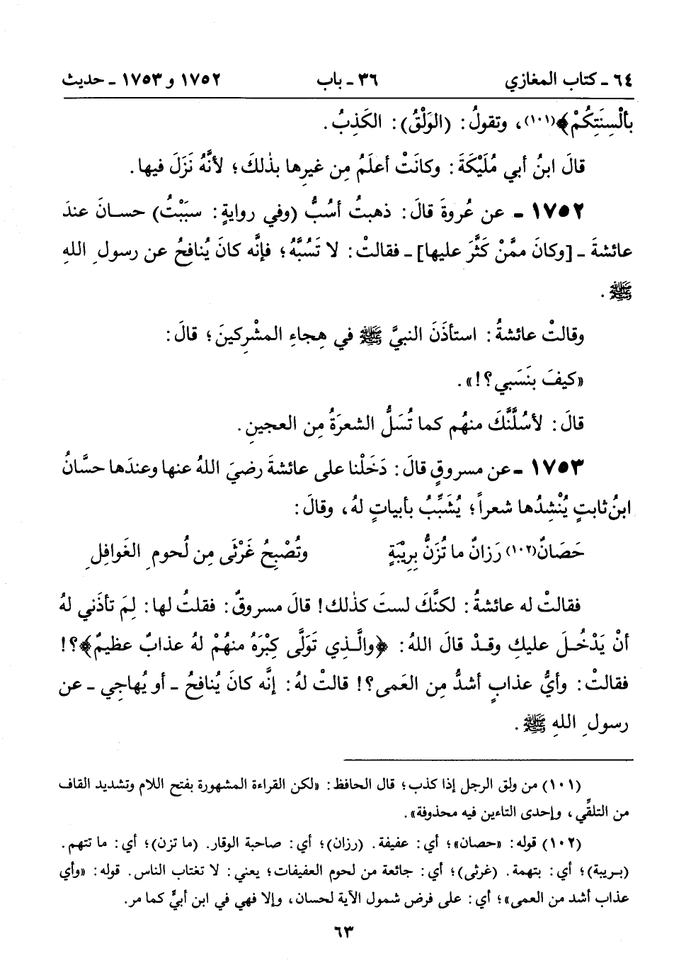 (102) قوله: "حصان"؛ أي: عفيفة. (رزان)؛ أي: صاحبة الوقار. (ما تزن)؛ أي: ما تتهم. (بريبة)؛ أي: بتهمة. (غرثى)؛ أي: جائعة من لحوم العفيفات؛ يعني: لا تغتاب الناس. قوله: "وأي عذاب أشد من العمى"؛ أي: على فرض شمول الآية لحسان، وإلا فهي في ابن أبيٍّ كما مر.