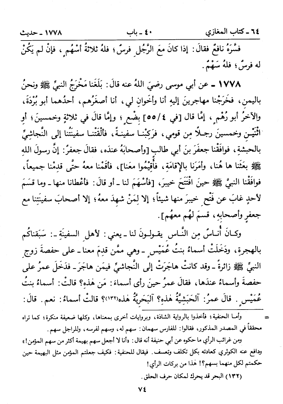 1778 - عن أبي موسى رضيَ اللهُ عنه قالَ: بَلَغَنا مَخْرَجُ النبيِّ - صلى الله عليه وسلم - ونحنُ باليمنِ، فخَرَجْنا مهاجرينَ إليهِ أنا وأخَوانِ لي، أنا أصغَرُهم، أحدُهما أبو بُرْدَةَ، والآخرُ أبو رُهْمٍ، إمَّا قال [في 4/ 55] بِضْعٍ؛ وإمَّا قالَ في ثلاثةٍ وخمسينَ؛ أوِ اثْنَيْنِ وخمسينَ رجلًا مِن قومي، فرَكِبْنا سفينةً، فالْقَتْنا سفينَتُنا إلى النَّجاشِيِّ بالحبشةِ، فوافَقْنا جعفَرَ بنَ أبي طالبٍ [وأصحابَهُ عندَه، فقالَ جعفرٌ: إنَّ رسولَ اللهِ - صلى الله عليه وسلم - بعَثَنا ها هُنا، وأمَرَنا بالِإقامَةِ، فأَقِيْمُوا معَنا]، فأقَمْنا معهُ حتَّى قدِمْناً جميعاً، فوافَقْنا النبيَّ - صلى الله عليه وسلم - حينَ افْتَتَحَ خيبرَ، [فأسْهَمَ لنا -أو قالَ: فأعْطانا منها- وما قسَمَ لأحدٍ غابَ عن فَتْحِ خيبرَ منها شيئاً؛ إلا لِمَنْ شهِدَ معهُ؛ إلا أصحابَ سفينَتِنا مع جعفرٍ وأصحابهِ، قسمَ لهُم معهُم].