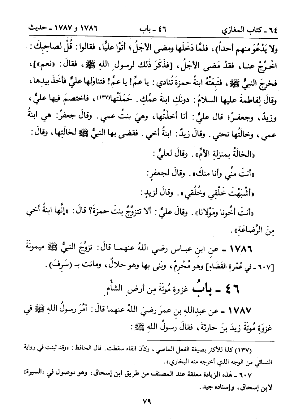 "أنتَ أخُونا ومَوْلانا". وقالَ عليٌّ: ألا تتزوَّجُ بنتَ حمزةَ؟ قالَ: "إنَها ابنةُ أخي مِنَ الرَّضاعَةِ".