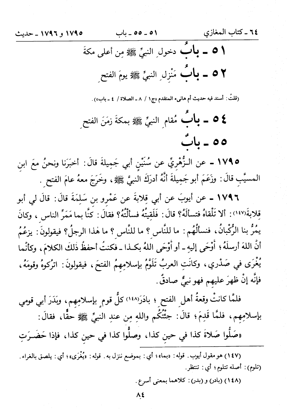 1796 - عَنْ أيوبَ عَنْ أَبِى قِلاَبَةَ عَنْ عَمْرِو بْنِ سَلِمَةَ قَالَ: قَالَ لِي أَبُو قِلاَبَةَ (147): أَلاَ تَلْقَاهُ فَتَسْأَلَهُ؟ قَالَ: فَلَقِيتُهُ فَسَأَلْتُهُ؟ فَقَالَ: كُنَّا بِمَاءٍ مَمَرَّ النَّاسِ، وَكَانَ يَمُرُّ بِنَا الرُّكْبَانُ، فَنَسْأَلُهُمْ: مَا لِلنَّاسِ؟ مَا لِلنَّاسِ؟ مَا هَذَا الرَّجُلُ؟ فَيَقُولُونَ: يَزْعُمُ أَنَّ اللَّهَ أَرْسَلَهُ؛ أَوْحَى إِلَيْهِ -أَوْ أَوْحَى اللَّهُ بِكَذَا- فَكُنْتُ أَحْفَظُ ذَلِكَ الْكَلاَمَ، وَكَأَنَّمَا يُغْرَى فِى صَدْرِى , وَكَانَتِ الْعَرَبُ تَلَوَّمُ بِإِسْلاَمِهِمِ الْفَتْحَ، فَيَقُولُونَ: اتْرُكُوهُ وَقَوْمَهُ، فَإِنَّهُ إِنْ ظَهَرَ عَلَيْهِمْ فَهْوَ نَبِىٌّ صَادِقٌ.