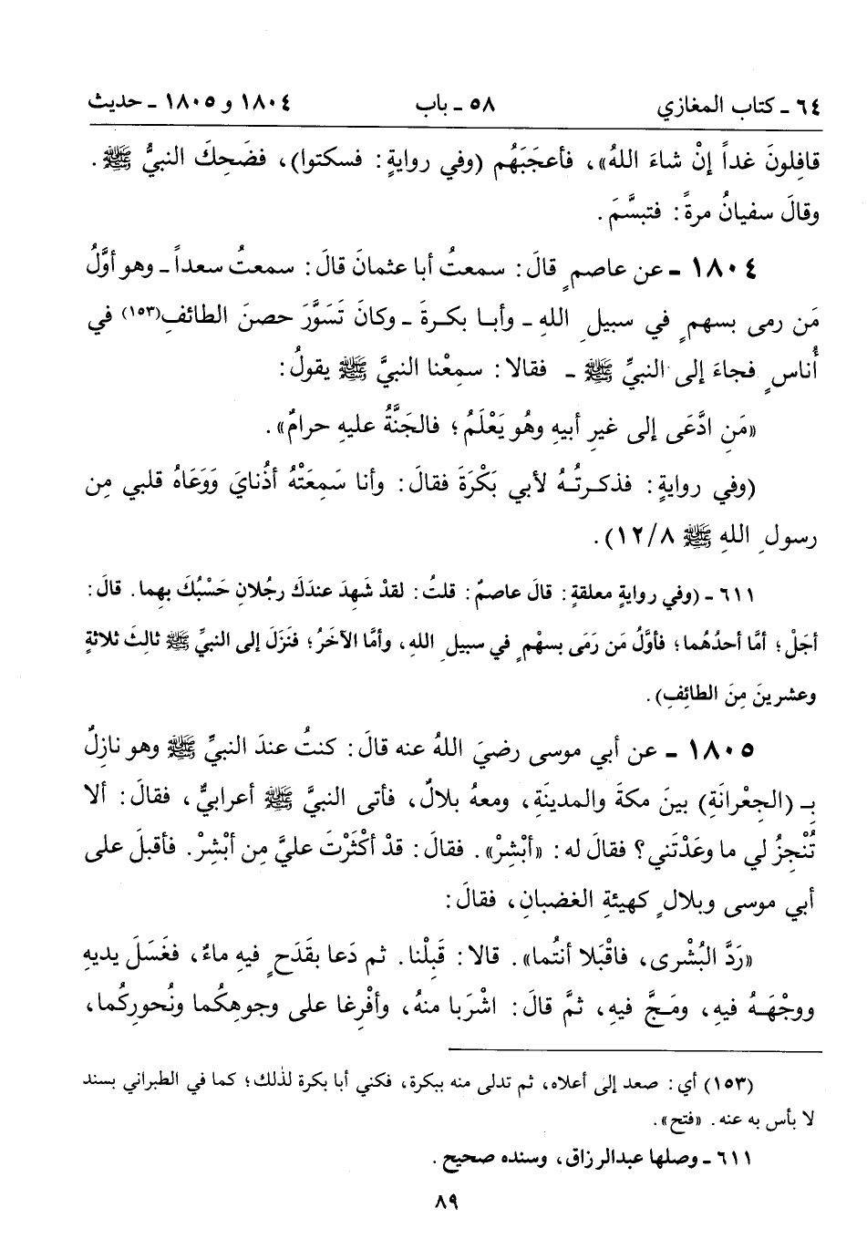 1804 - عن عاصمٍ قالَ: سمعتُ أبا عثمانَ قالَ: سمعتُ سعداً -وهو أوَّلُ مَن رمى بسهمٍ في سبيلِ اللهِ- وأبا بكرةَ -وكانَ تَسَوَّرَ حصنَ الطائفِ (153) في أُناسٍ فجاءَ إلى النبيِّ - صلى الله عليه وسلم - فقالا: سمعْنا النبيَّ - صلى الله عليه وسلم - يقولُ: